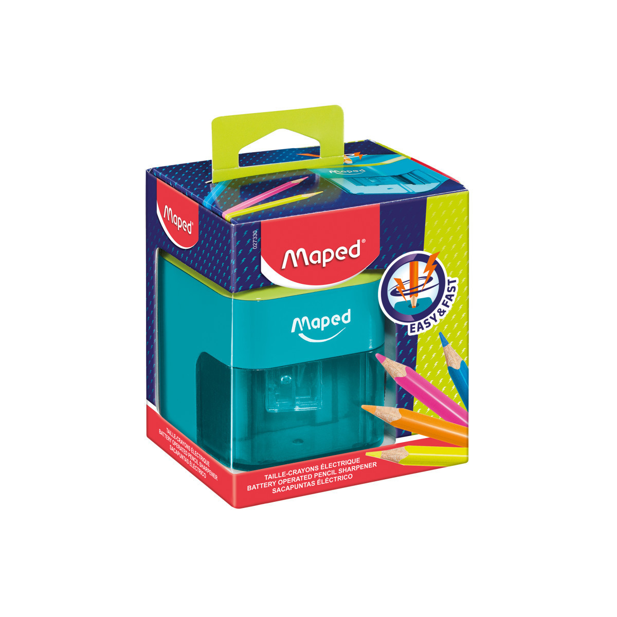 The Maped Compact 1 Hole Battery Powered Pencil Sharpener is perfect for school, home or office use! Top mounted sharpening hole makes it easier to guide the pencil in, and a unique clutch mechanism lets you still use the sharpener as a manual sharpener even if the batteries die. The compact shape is great for desks and drawers and the bright, fun coloring helps add a pop of color to your work area! Sharpens all shapes of standard pencils, including graphite, wood-free and even colored pencils! Operates on 4 "AA" batteries (not included) and features a translucent removable shavings container so you can see when it needs to be emptied.