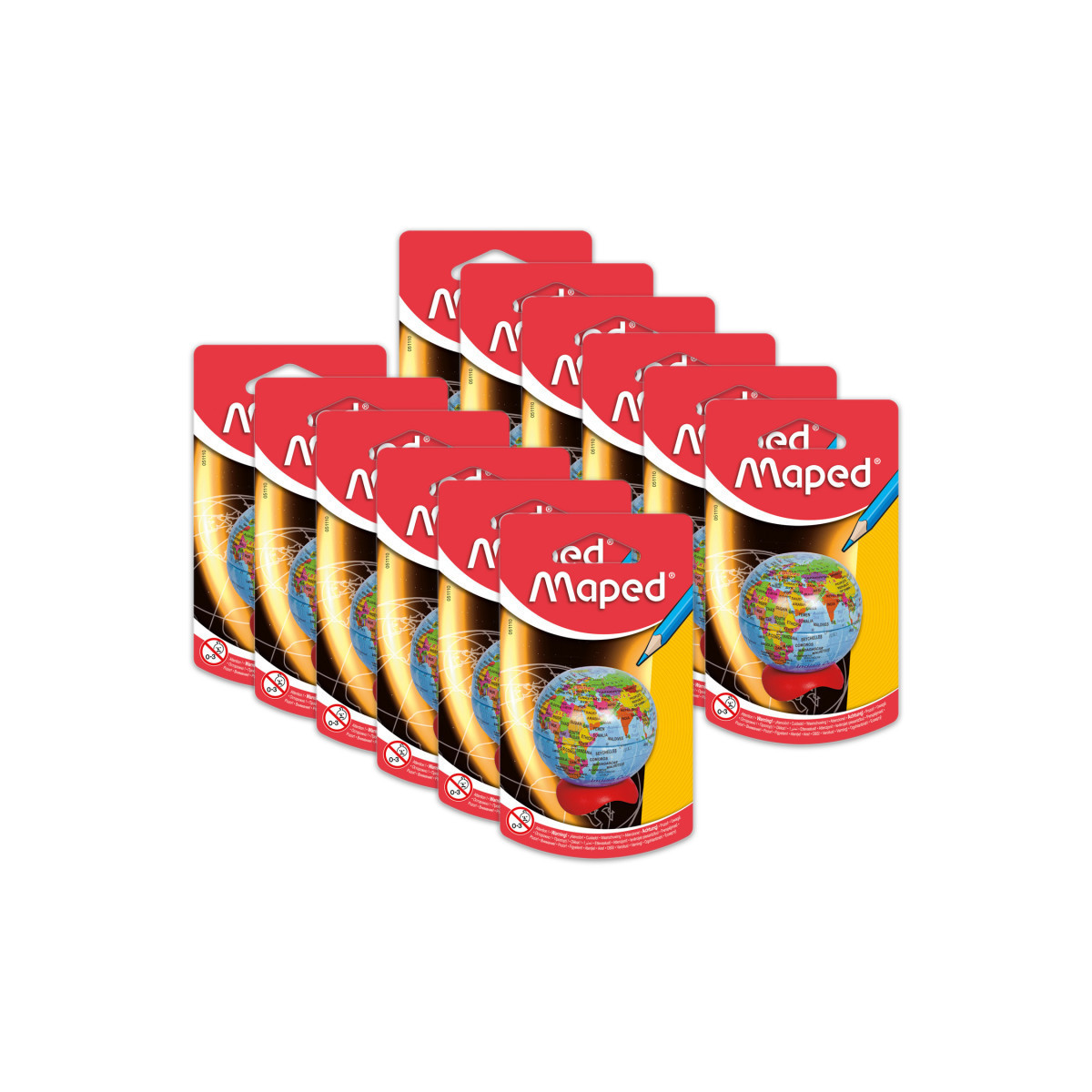The Maped Globe Sharpener features a high-resolution world map printed on the body - perfect for helping kids better understand geography! The globe base has an integrated 1 hole pencil sharpener that easily sharpens all standard pencils, and the metal globe body serves as the shavings container to keep your workspace clean. Compact size is great for cluttered desks, bags and backpacks - never be without a sharpener again! Sold as a pack of 12 pencil sharpeners.