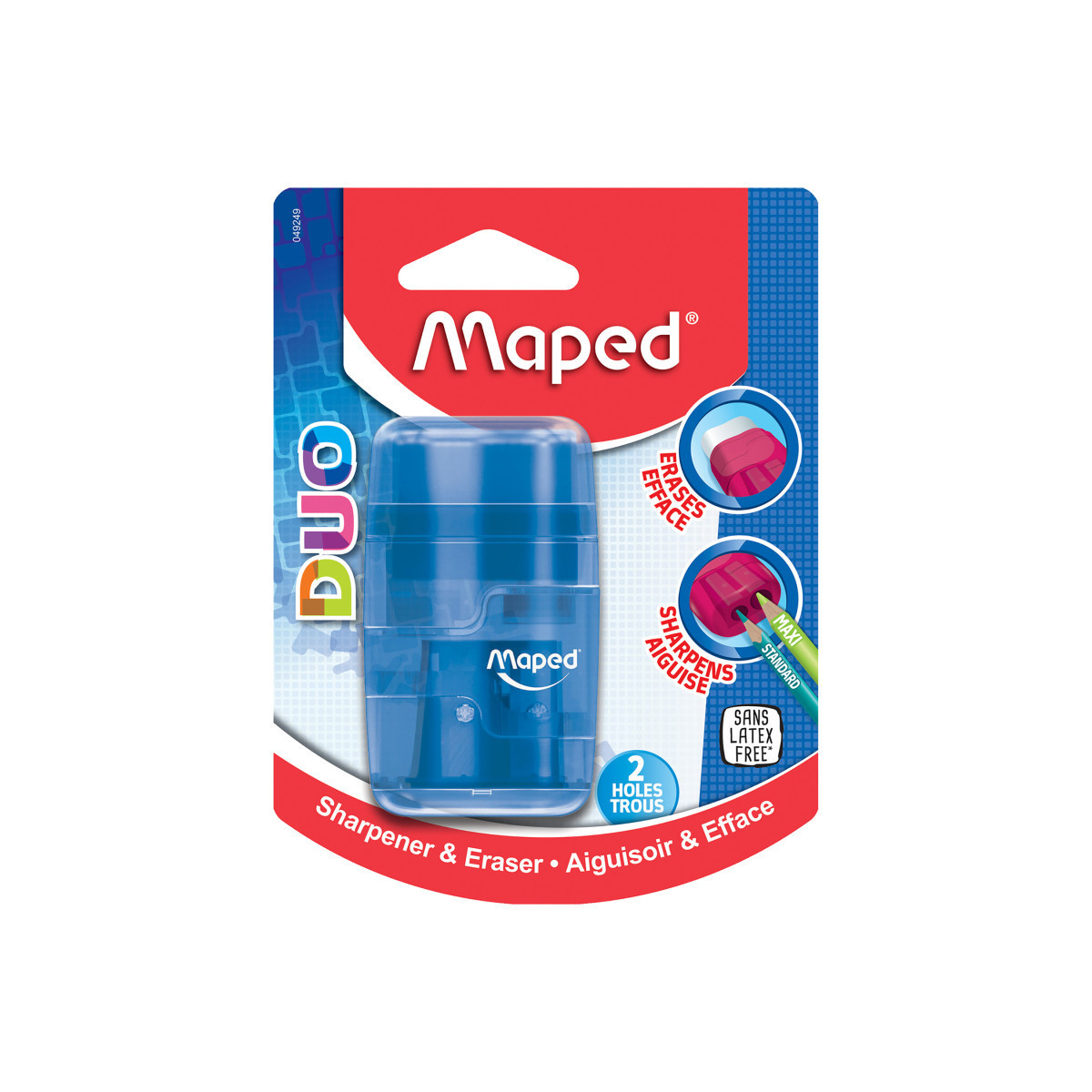 The Maped Connect DUO 2 Hole Sharpener & Eraser easily separates into two pieces - mix and match the colors to create your own! Remove the top cover to find a super-soft eraser, and flip open the bottom cap to access the 2 hole pencil sharpener for standard & jumbo sized pencils! With a body made of shatter-resistant, transparent plastic it's always each to tell when you need to empty the shavings canister. Eraser is latex, PVC and phthalate free. Sold in assorted colors: Blue, Green or Pink (no color choice).