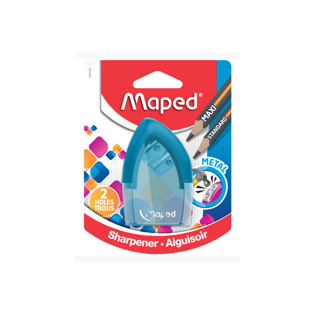 Perfect for school or the office, the Maped Tonic 2 Hole Sharpener easily handles standard or jumbo pencils of all shapes and styles! Made of shatter-resistant plastics, the integrated canister keeps shavings contained and the metal sharpening insert is durable enough to last for years. Translucent canister made with shatter resistant plastic for mess-free use and transport. Sold as 1 sharpener in assorted colors Blue or Teal (no color choice).