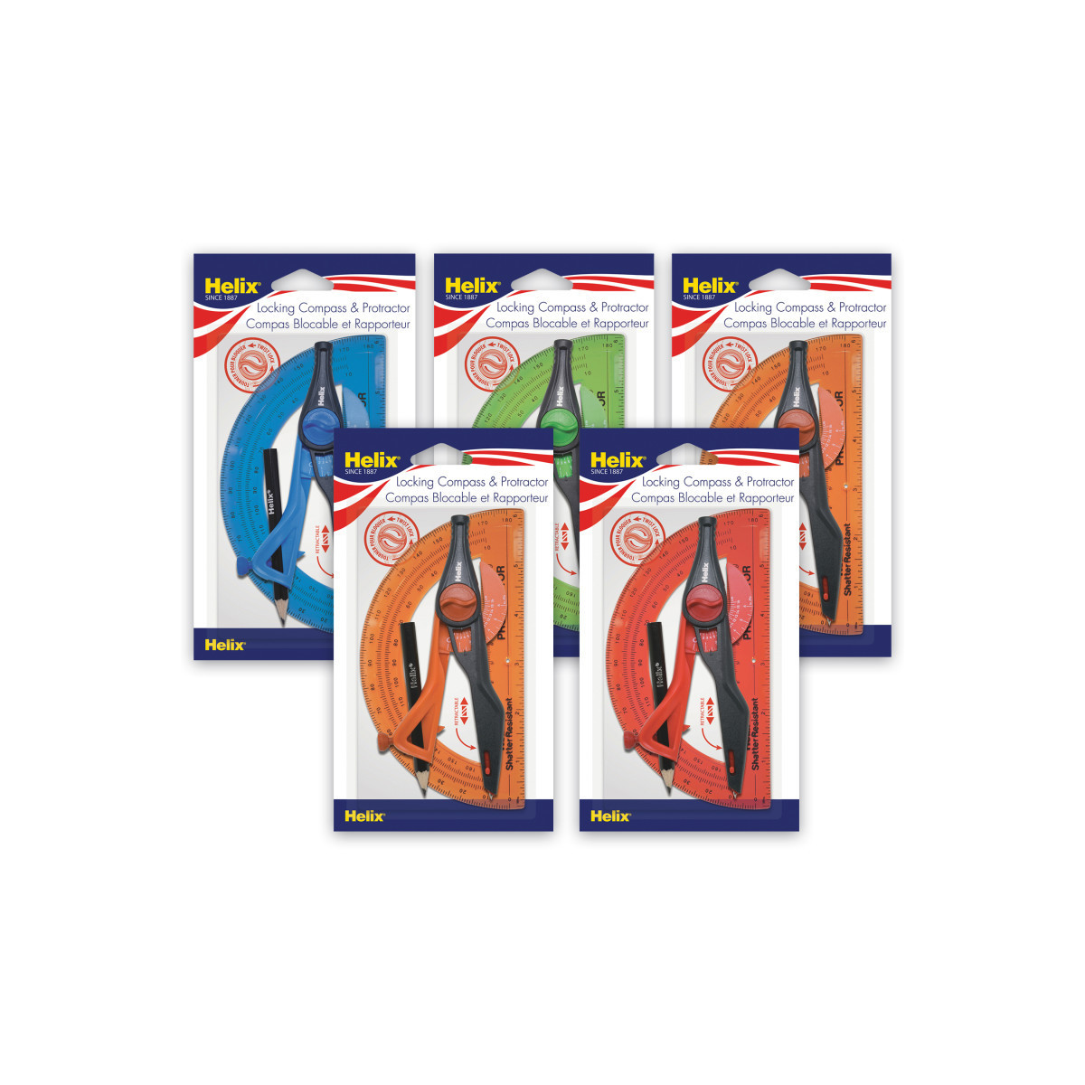 Modern, ergonomic compass perfect for all ages! Features a twist-lock that secures the legs in place for accurate circle size and guaranteed precision. Innovative Safety Tip automatically retracts when you close the compass legs to avoid potential injuries in a bag or case. Integrated distance measuring arm is graduated in both inch and metric. The 6" shatter-resistant protractor is made with translucent material and beveled edges for ease of use. Each 2-piece set includes a Plastic Locking Compass and Shatter-resistant Protractor in Blue, Green, Red or Orange (no color choice). Sold as a pack of 5 sets.
