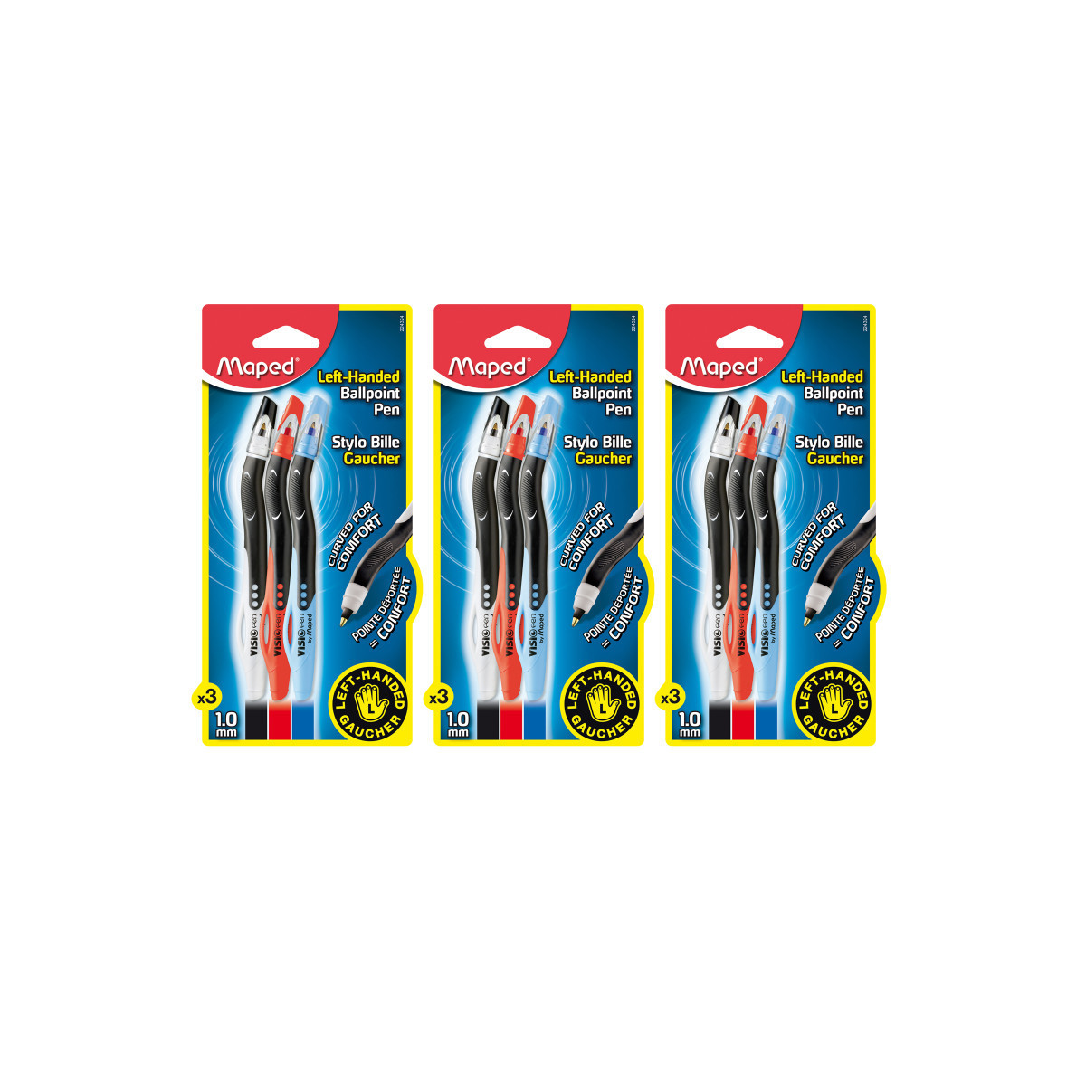 Maped® Visio Left-Handed Pen. Designed for left-handed writers, this ball-point pen has quick-drying ink, a rubberized grip section, and a line width of 0.7 mm. Cap design. Disposable. Each pack includes 3 pens: black, blue, and red. Sold as 3 packs for a total of 9 pens.