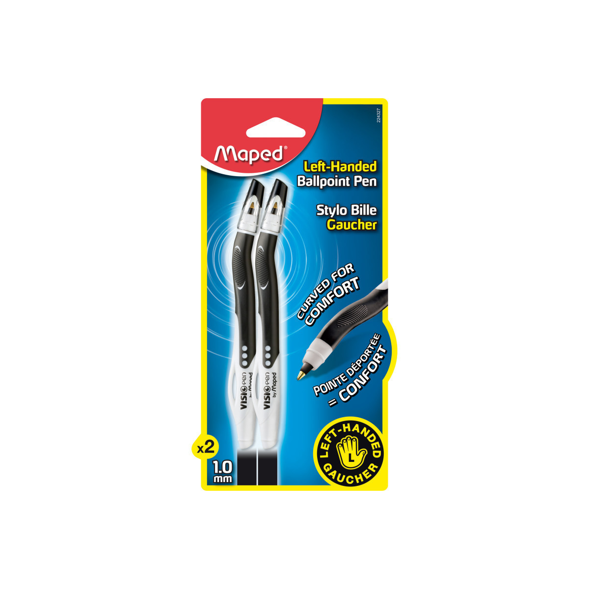 Maped® Visio Left-Handed Pen 2-pack includes 2 black pens. The Visio Pen is an ergonomic pen that allows left-handed people to see what they write. This disposable ball-point pen has quick-drying ink, a rubberized grip section, a cap design, and a line width of 0.7 mm. The Maped® left-handed products are truly adapted to the left-handed individual with mirrored shapes and unique designs. Guaranteed comfort for all left handers!