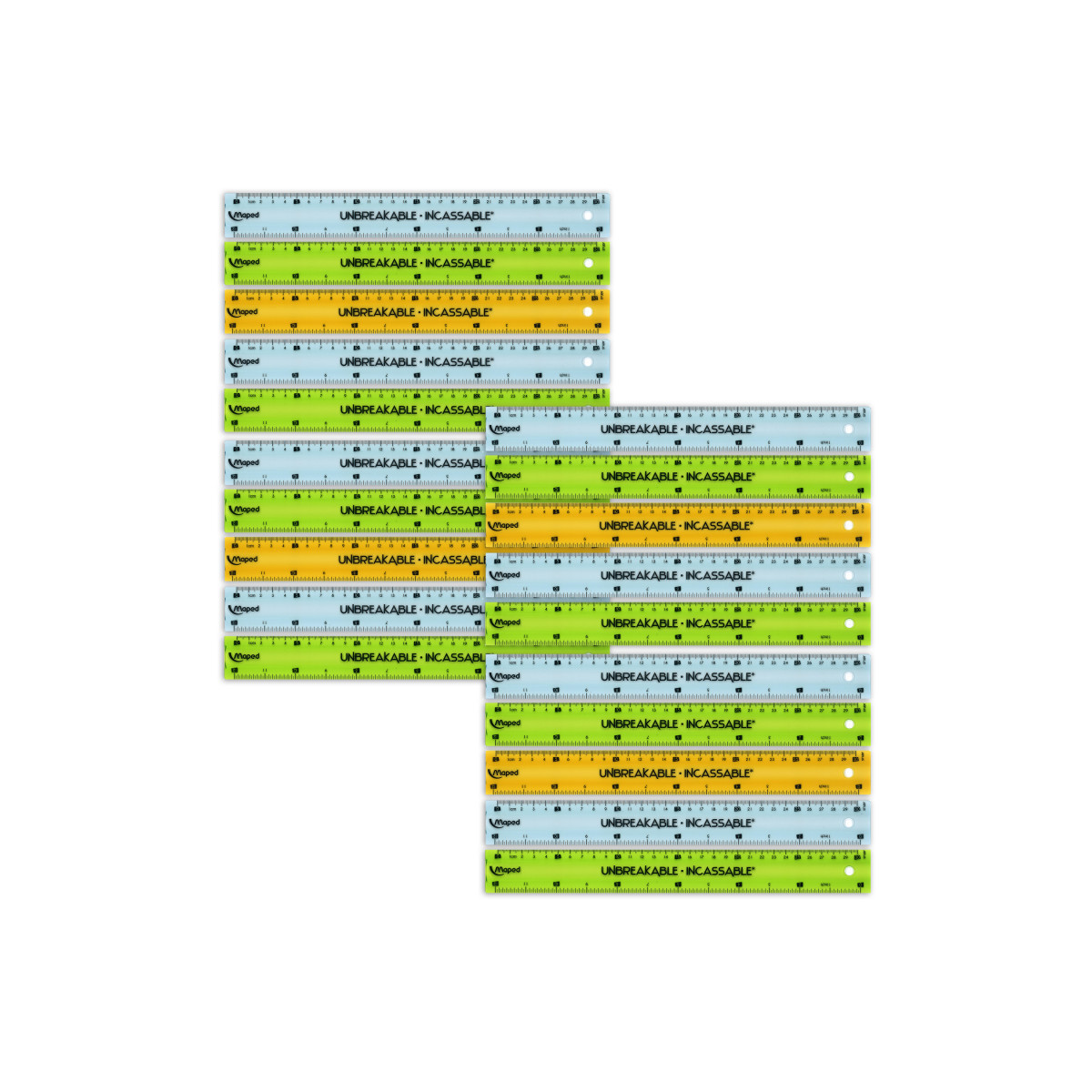The Unbreakable Ruler from Maped is made of a unique material that is durable enough for even the messiest classrooms, but is still light and flexible enough for even the youngest students to use. Three fun, transparent colors makes it easy to see what you are measuring. Features both Imperial and Metric graduations and a convenient hang hole for storage. Ruler is unbreakable under normal conditions and use. Sold as a pack of 20 in assorted colors: Teal, Blue and Orange (no color choice).