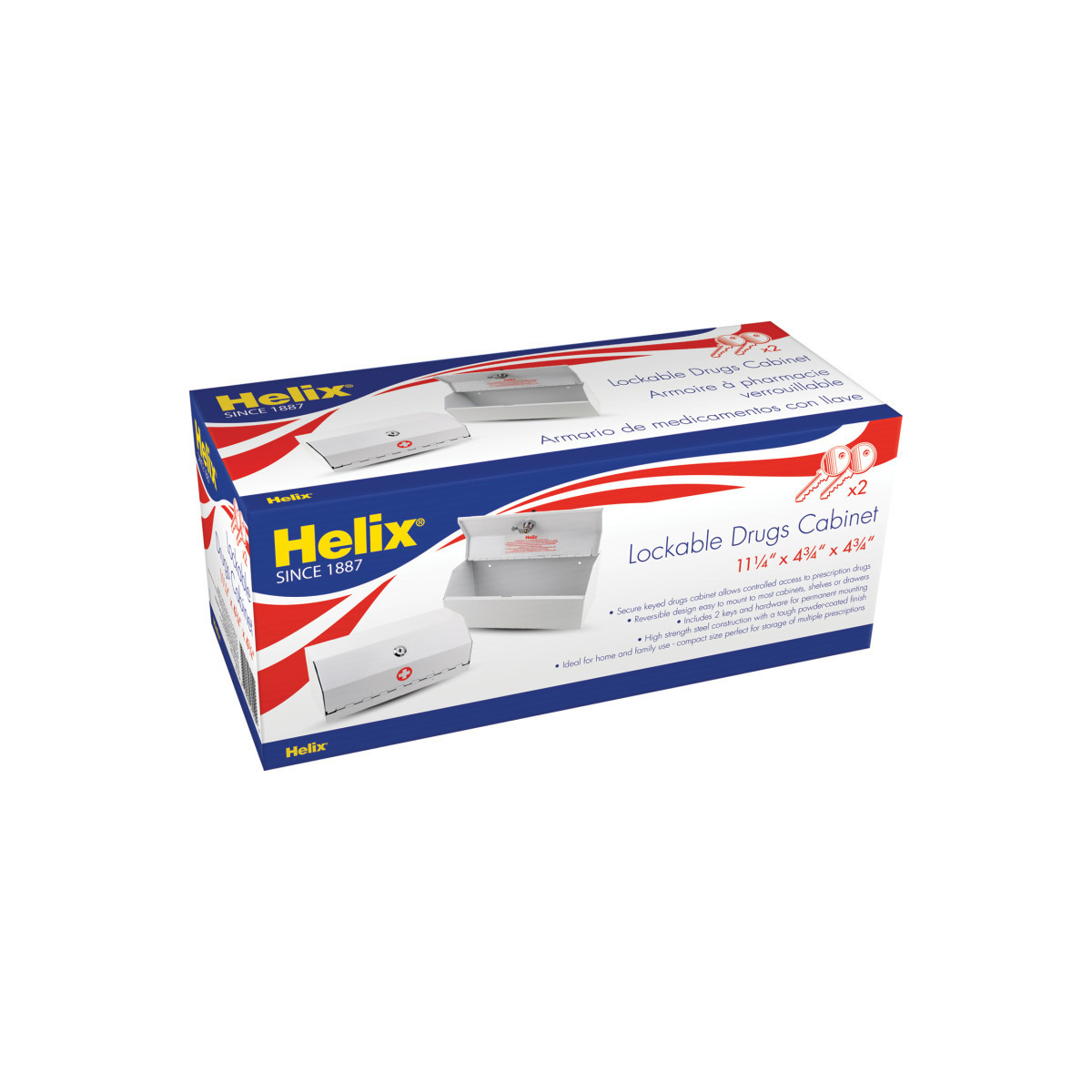 Ideal for home, office, and dorms, the Lockable Drug Cabinet keeps prescription drugs locked away from children and those for whom they are not prescribed. Heavy duty steel safe mounts easily to a wall or cabinet with included hardware in multiple positions! Durable, white powder coat finish easy to clean and doesn't draw extra attention to drugs stored inside. Safe includes 2 keys for lock, screws and anchors for mounting and a Red Cross applique. Not intended to act as an absolute fail-safe to entry. Dimensions: 11-1/4" x 4-3/4" x 4-1/4".