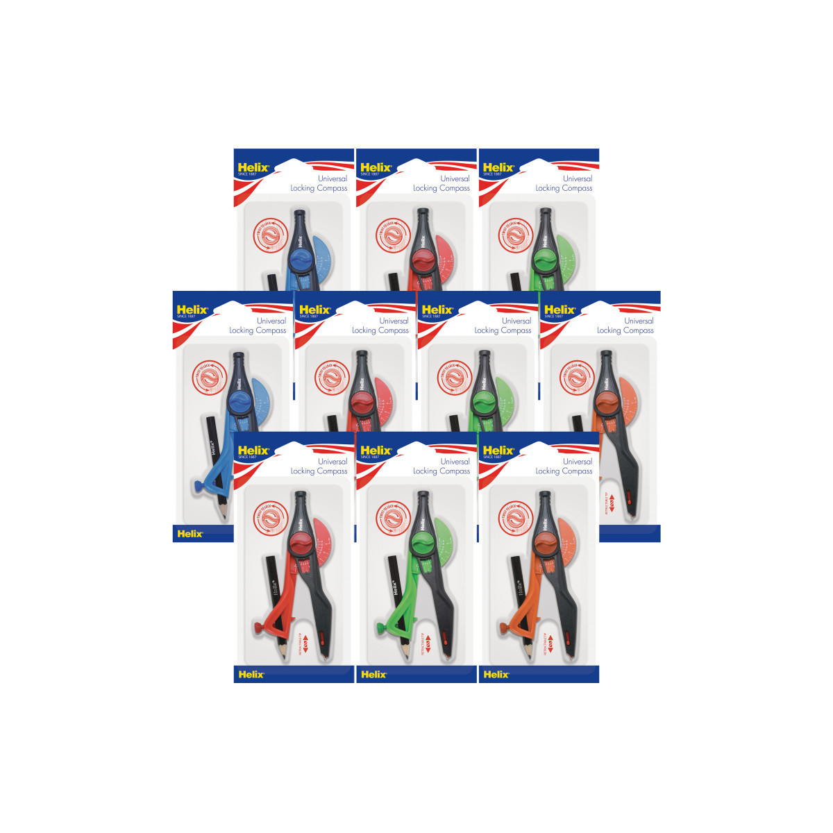 Modern, ergonomic compass perfect for all ages! Features a twist-lock secures the legs in place for accurate circle size and guaranteed precision. Innovative Safety Tip automatically retracts when you close the compass legs, to avoid potential injuries in a bag or case. Integrated distance measuring arm is graduated in both inch and metric. Sold as a pack of 10 compasses in assorted colors (no color choice): Blue, Green, Red and Orange.