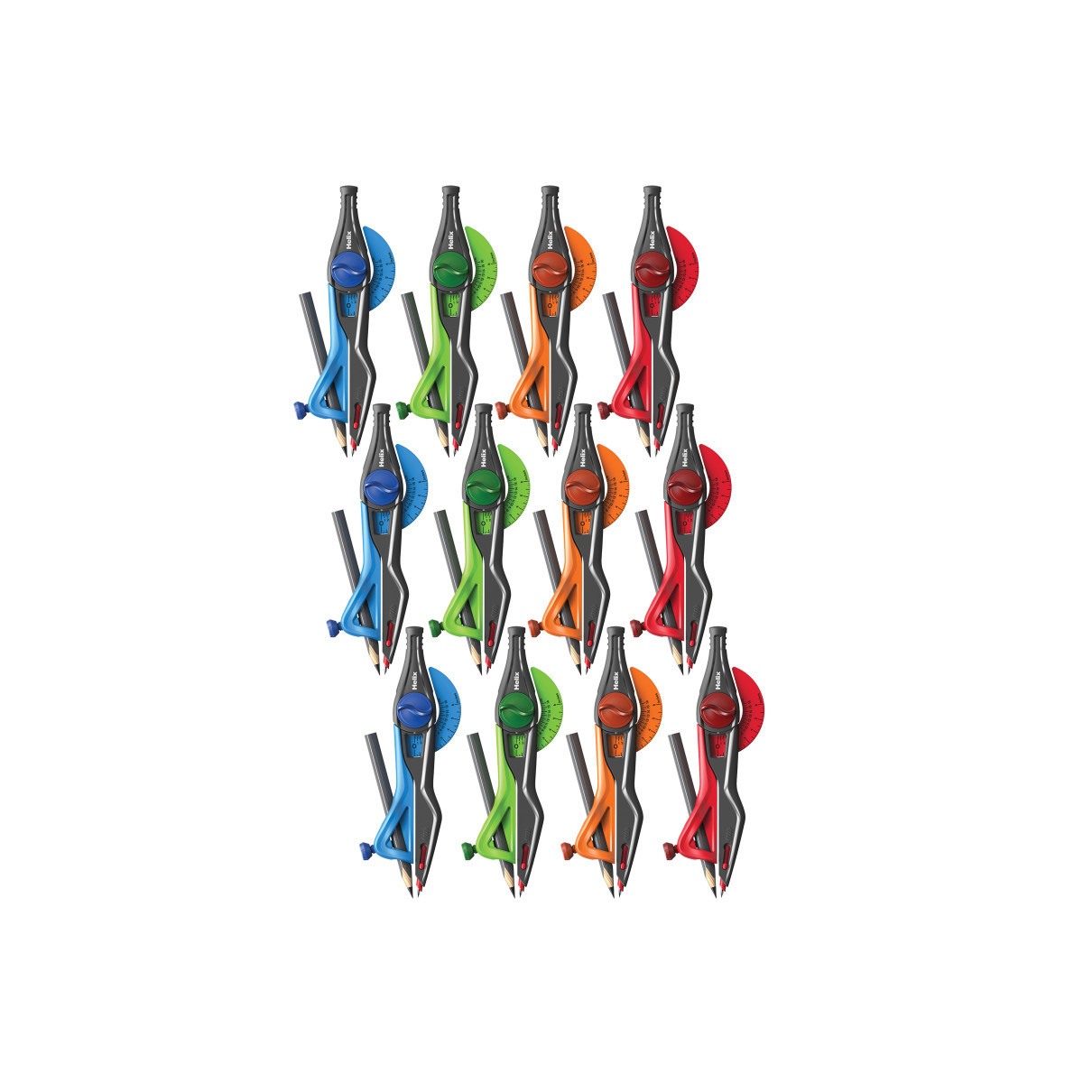 Modern, ergonomic compass perfect for all ages! Features a twist-lock secures the legs in place for accurate circle size and guaranteed precision. Innovative Safety Tip automatically retracts when you close the compass legs, to avoid potential injuries in a bag or case. Integrated distance measuring arm is graduated in both inch and metric. Sold as a pack of 12 in assorted colors: Blue, Green, Red and Orange (no color choice).