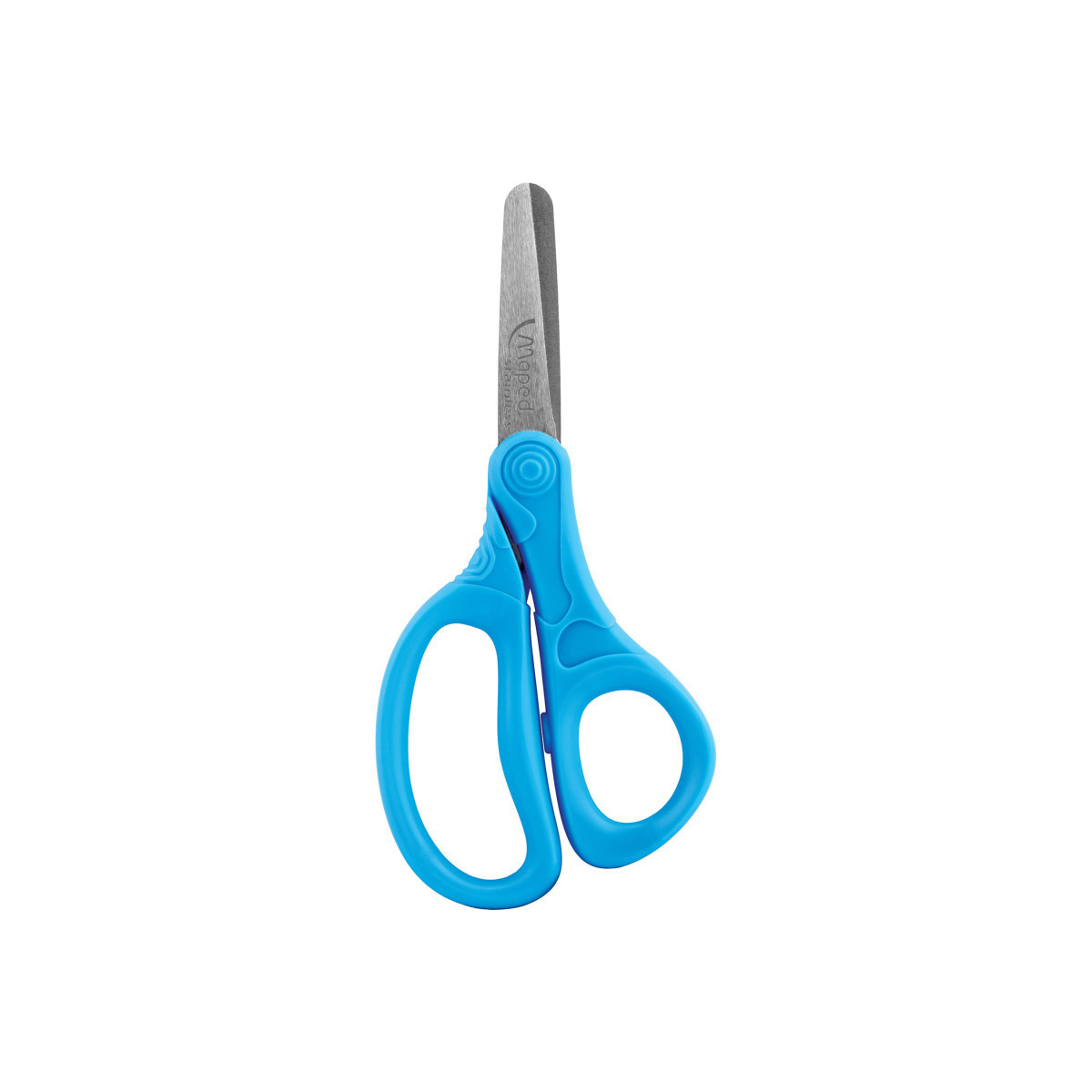 Maped Essentials Kids School Scissors are perfect for young students going back to school! Modern 5" / 13cm design features Blunt Tip Stainless Steel Blades with a rounded tip that is safer others you can find on the market and are much more appropriate for young students. Eye-catching asymmetrical handles are perfect size for young hands to hold, and are perfect for students 4+ years old. Sold in assorted colors Blue, Light Blue, Red or Green (no color choice).