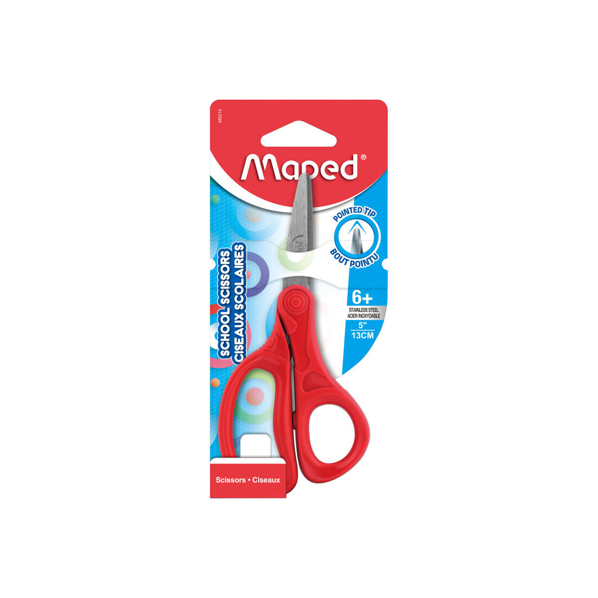 Maped Essentials Kids School Scissors are perfect for young students going back to school! Modern 5" / 13cm design features Pointed Tip Stainless Steel Blades with a rounded tip that is safer others you can find on the market and are much more appropriate for young students. Eye-catching asymmetrical handles are perfect size for young hands to hold, and are perfect for students 6+ years old. Sold in assorted colors Blue, Light Blue, Red or Green (no color choice).