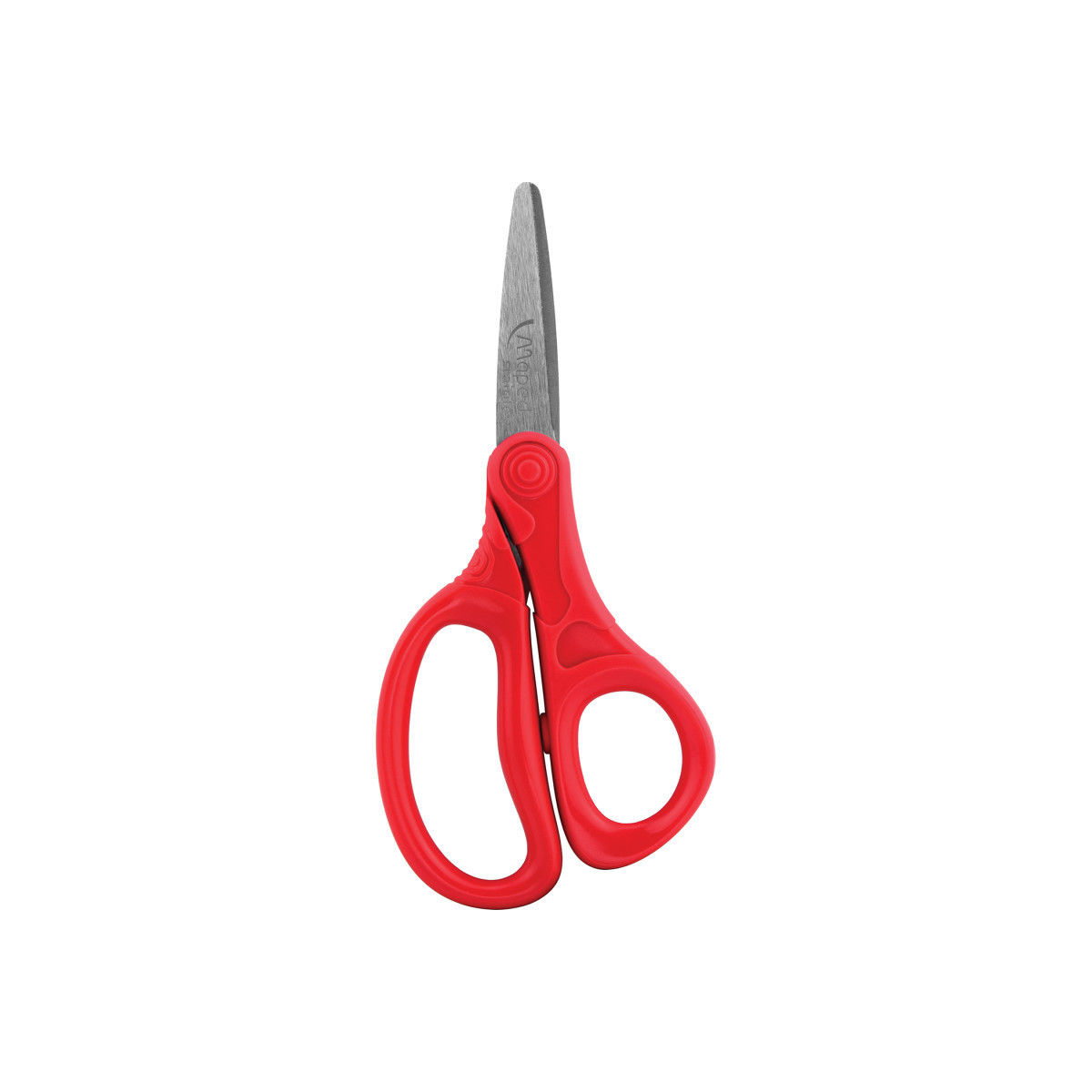 Maped Essentials Kids School Scissors are perfect for young students going back to school! Modern 5" / 13cm design features Pointed Tip Stainless Steel Blades with a rounded tip that is safer others you can find on the market and are much more appropriate for young students. Eye-catching asymmetrical handles are perfect size for young hands to hold, and are perfect for students 6+ years old. Sold in assorted colors Blue, Light Blue, Red or Green (no color choice).