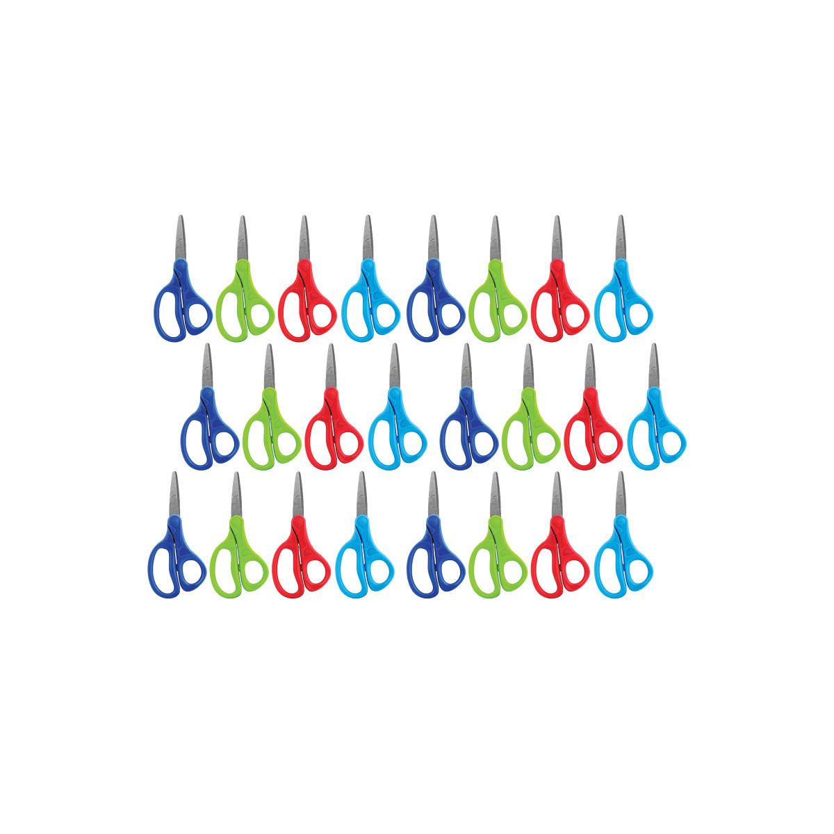 Maped Essentials Kids School Scissors are perfect for young students going back to school! Modern 5" / 13cm design features Pointed Tip Stainless Steel Blades with a rounded tip that is safer others you can find on the market and are much more appropriate for young students. Eye-catching asymmetrical handles are perfect size for young hands to hold, and are perfect for students 6+ years old. Sold as a pack of 24 in assorted colors: Blue, Light Blue, Red and Green (no color choice).