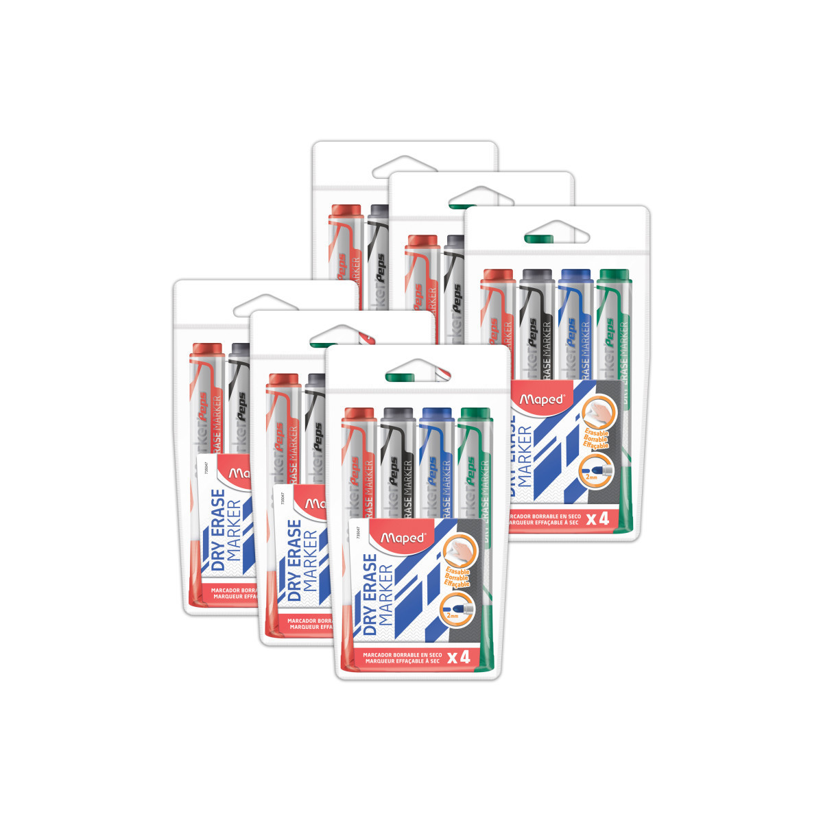 Maped Marker'Peps Dry Erase Jumbo Chisel Tip Markers are a new range of oversized Dry Erase markers that are perfect for office, school or home! Super vibrant inks help make learning fun and encourage creativity, and are low odor so there are no headaches or safety concerns. Ink easily wipes off all non-porous surfaces like whiteboards, blackboards & glass! 4mm Chisel tip is perfect for large white boards where you need a thicker marker for visibility. Each pack includes 4 markers, Black, Blue, Red and Green, and comes in a reusable carrying case. Sold as 6 packs for a total of 24 markers.