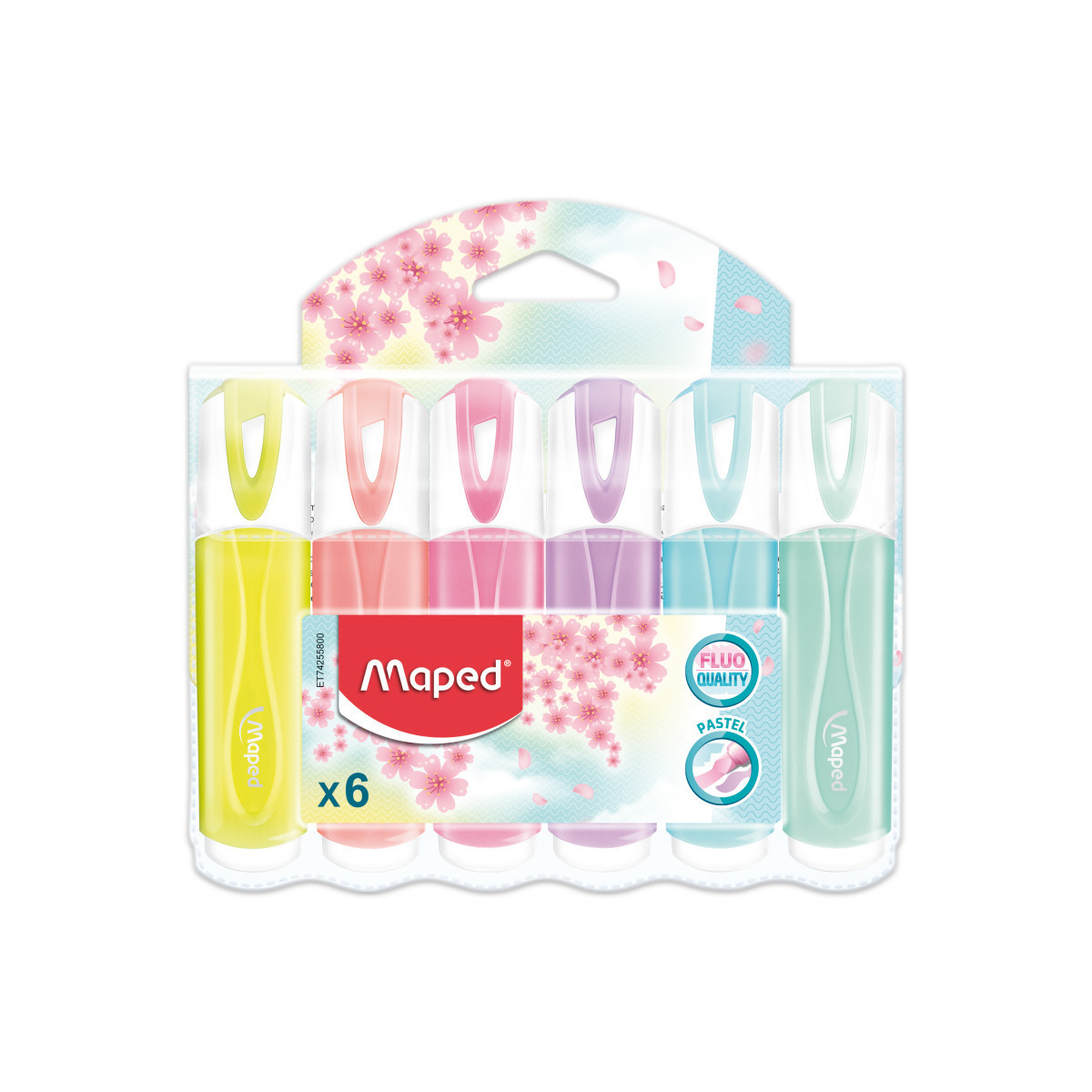 Fluo Pep Classic Pastel Highlighters are a fun new take on highlighters, perfect for school, home or office use! Their wide body fits comfortably in your hand and don't roll of your desk, and the super trendy Pastel ink really lets you show off your style! The soft, dual-beveled tip easily draws 5mm or 1mm lines depending on the side you hold the highlighter, and consistent ink dispensing make this highlighter the right tool for small or large jobs. Safe on all paper, inks, graphite, faxes, ink-jet printing and more! Set includes 6 unique Pastel colors (Blue, Green, Pink, Purple, Rose and Yellow) and come in a reusable storage case!
