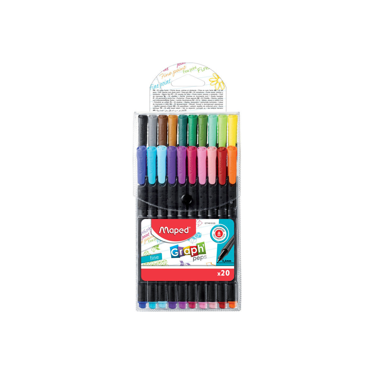 Maped Graph'Peps are perfect for writing, drawing, sketching and even everyday doodling! Bright, vibrant colors leap off the page from the 0.4mm nib-protected fine tip and will not bleed through most types of standard paper. Triangular shape will not roll and provides all day writing comfort. Pack of 20 comes in a compact and attractive reusable storage case for easy transport.