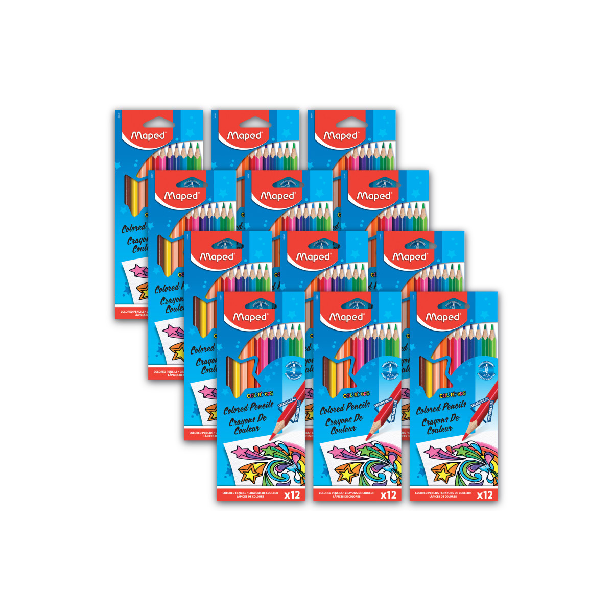 Bright and fun colored pencils provide hours of vibrant fun! Maped Color'Peps Triangular Colored Pencils feature a 2.9mm core with pigment that goes down smooth and but resists breakage, making them perfect for all types of drawing and writing. More comfortable than a standard pencil, the triangular body naturally indexes your fingers in the correct spot for more comfortable use and is recommended by teachers! The unique shape also stops the pencils from rolling when used on an inclined desk, while still sharpening cleanly in any standard pencil sharpener. Non-toxic and AP approved, each pack includes the following 12 colors: Dark Black, Woody Brown, Green Golf, Apple Green, Sunny Yellow, Blush, Fruity Orange, Red Kiss, Lovely Pink, Aubergine (Purple), Marina Blue and Bubble Blue. Sold as 12 packs for a total of 144 pencils.