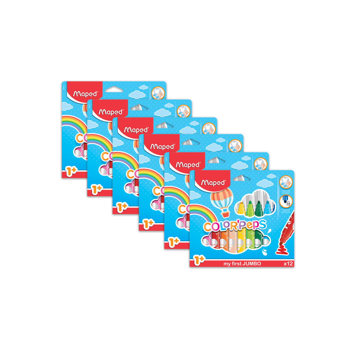 Color'Peps My First Safety Tip Ultrawashable Markers feature bright and fun Ultrawashable ink that is super easy to clean up! The unique 5mm Safety Tip is securely locked into the marker body, stopping children from crushing or removing it. With clear ventilated caps, these markers are perfect for young students learning to color and draw. Ultrawashable ink is super easy to remove from most fabrics and surfaces with warm soap and water, making cleanup a snap! Each pack includes the following 12 colors: Dark Black, Ultra Violet, Lovely Pink, Red Kiss, Fruity Orange, Blush, Sunny Yellow, Apple Green, Green Golf, Bubble Blue, Marina Blue and Woody Brown. Sold as 6 packs for a total of 72 markers.
