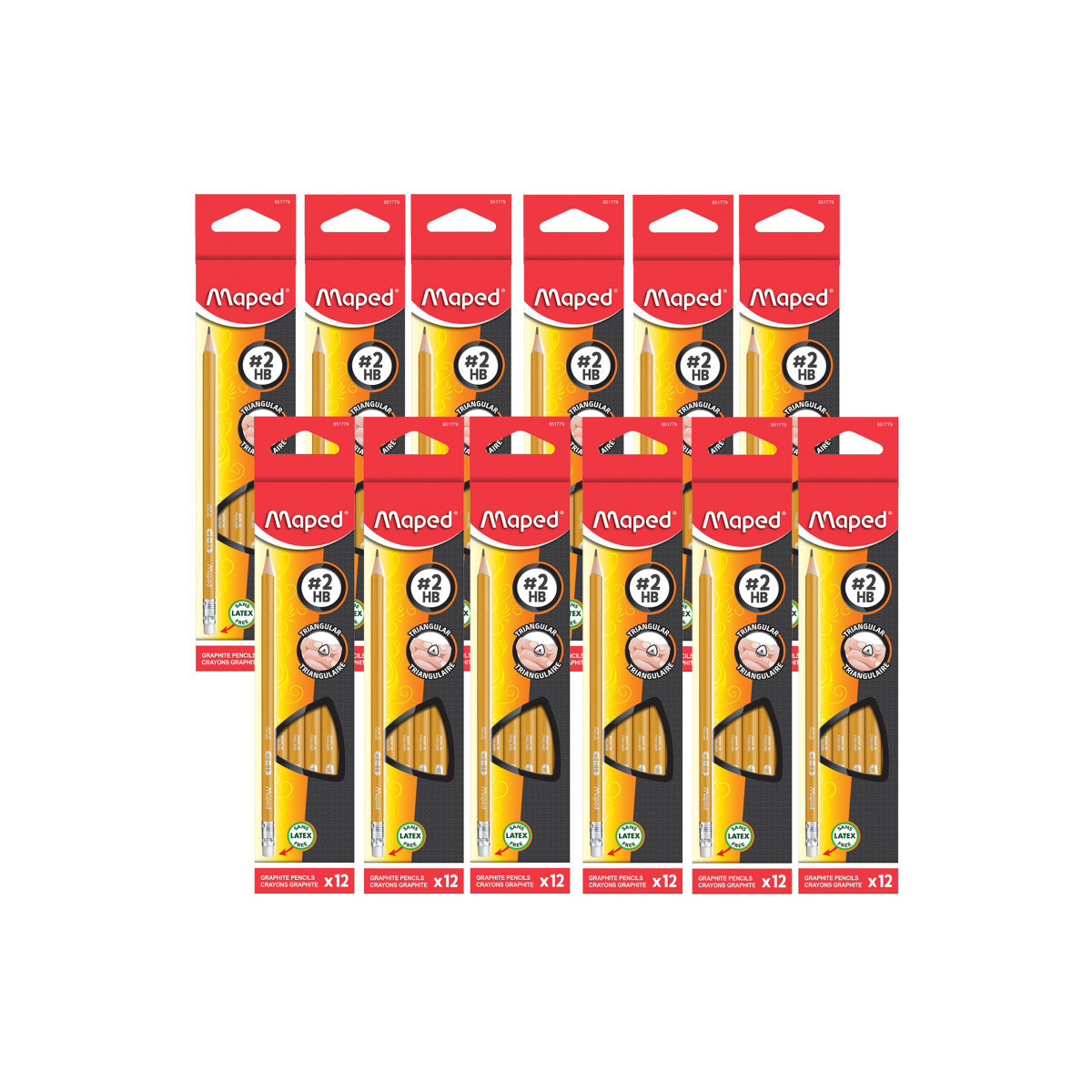 Write more comfortably with this ergonomic, pre-sharpened #2 pencil! Unlike a standard hexagonal pencil, the triangular body of the Maped Essentials Yellow Graphite Pencils naturally index your fingers in the correct spots for a more comfortable hold, and they will not roll off of a desk or table! High quality #2 / HB graphite is break resistant and fully bonded to the wood casing so it sharpens and writes cleanly with no splinters or separated lead. Classic yellow pencil perfect for school with a Latex, PVC and Phthalate free eraser that cleanly removes graphite without smearing or tearing. Easy to sharpen in any standard pencil sharpener! Each pack includes 12 pencils. Sold as 12 packs for a total of 144 pencils.