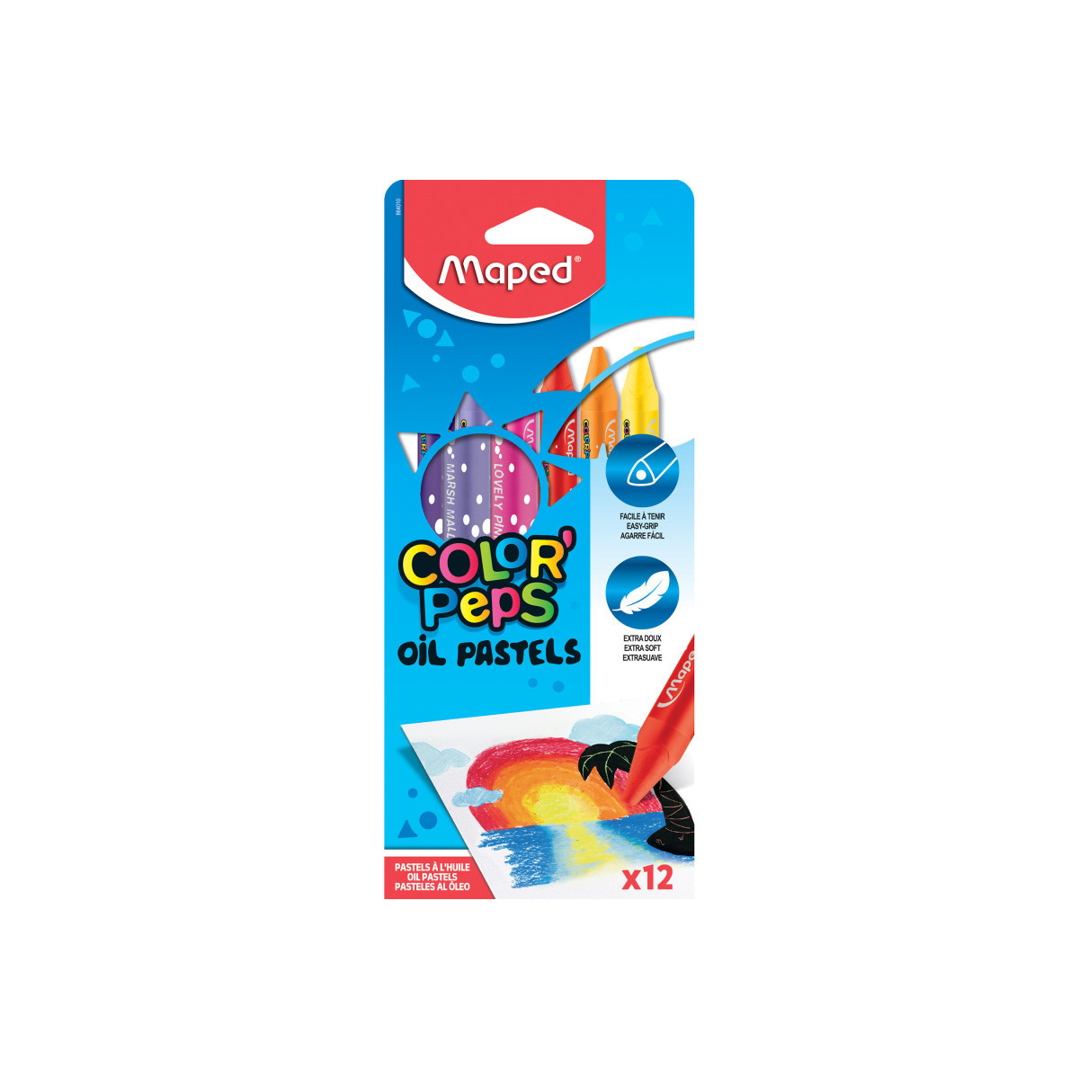 Color'Peps Triangular Oil Pastels are the perfect tool to introduce young artists to the whole range of pastels! Characterized by smooth and even coloring, these pastels are easy to blend and smear to any desired result and the vibrant pigments leap off the page. More comfortable than a round pastel, the oversized triangular body naturally indexes your fingers in the correct spot for more comfortable use and is recommended by teachers! The unique shape also stops the pastels from rolling off a desk and all come wrapped in paper to keep hands clean. 12 Pack includes the following colors: Dark Black, Woody Brown, Marina Blue, Green Golf, Apple Green, Marshmallow, Fruity Orange, Lovely Pink, Eggplant, Red Kiss, Sunny Yellow, Blue Lagoon and Bubble Blue