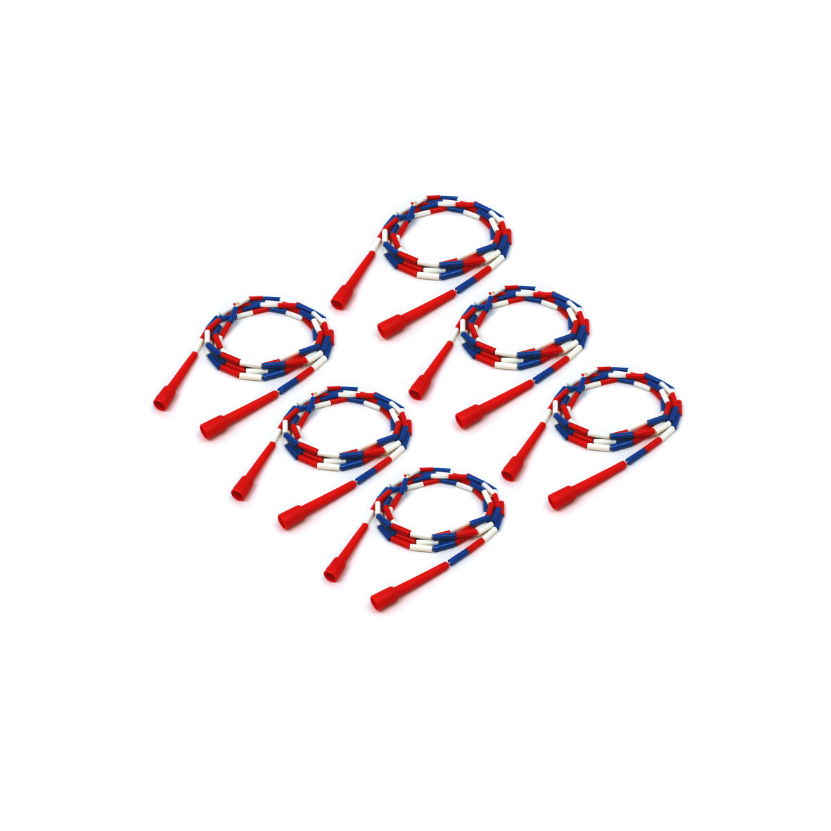 Plastic segments add weight to the rope which makes it easier to develop jump rope skills. Jump rope measures 10 feet long. Our red white and blue jump rope is durable and made of heavy nylon rope covered in unbreakable sections made of plastic. Sold as a pack of 6 jump ropes.