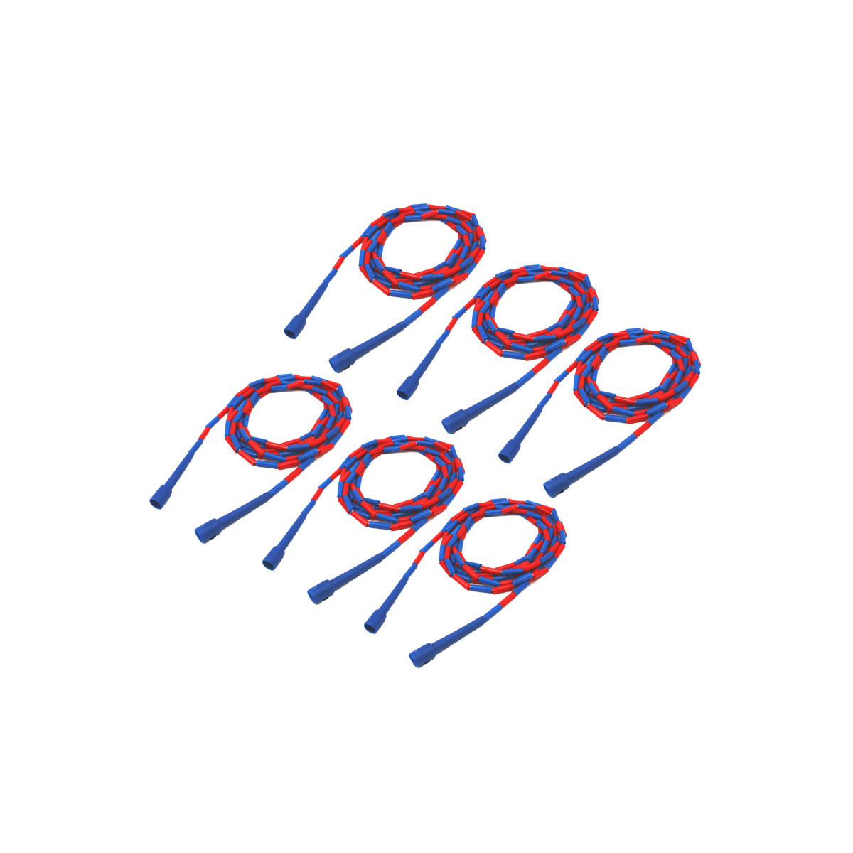 Plastic segments add weight to the rope which makes it easier to develop jump rope skills. Jump rope measures 16 feet long. Our red white and blue jump rope is durable and made of heavy nylon rope covered in unbreakable sections made of plastic. Sold as a pack of 6 jump ropes.