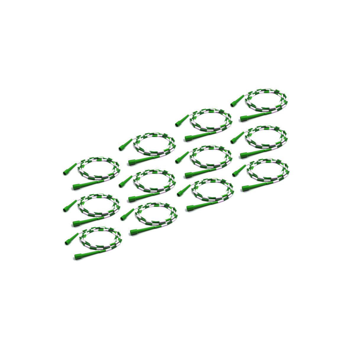 Plastic segments add weight to the rope which makes it easier to develop jump rope skills. Jump rope measures 7 feet long. Our green and white jump rope is durable and made of heavy nylon rope covered in unbreakable sections made of plastic. Sold as a pack of 12 jump ropes.