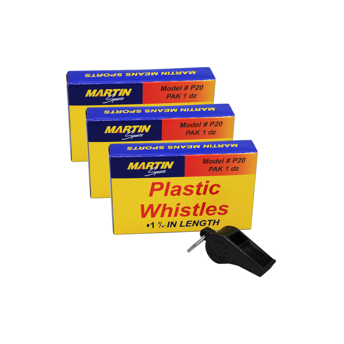 Get their attention with the Martin Sports Small Plastic Whistle. This pea whistle features a metal ring for easy attachment. Measures 1.75" L. Each pack includes 12 whistles. Sold as 3 packs for 36 whistles total.