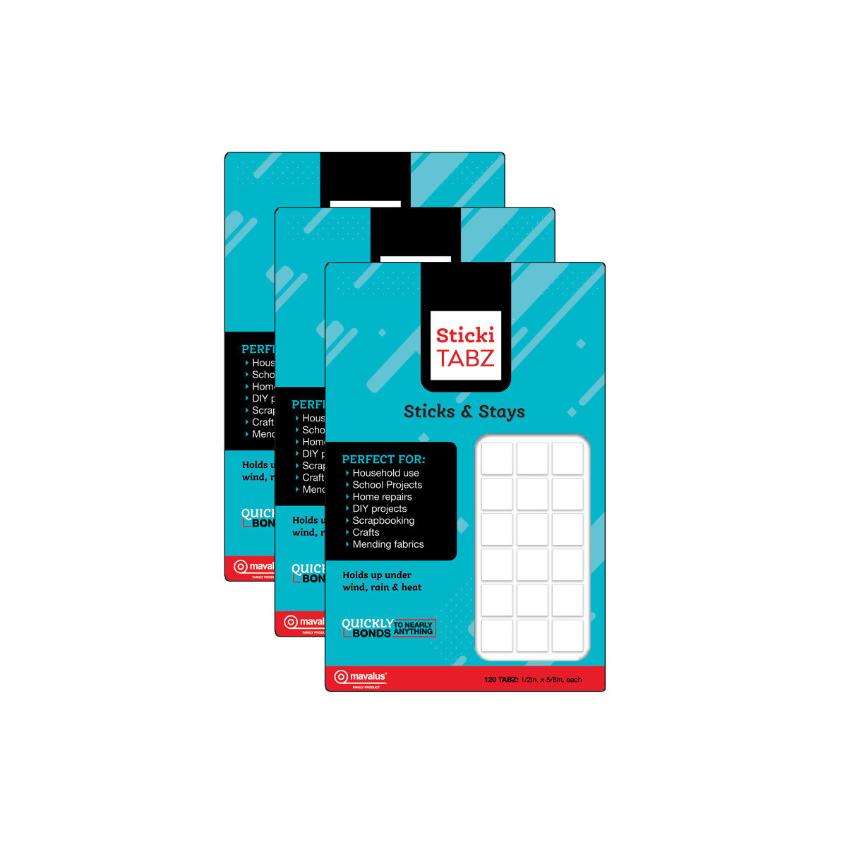 Double-coated non toxic rubber tape provides an instant bond with no cure or dry time. Cleanly removes from most surfaces. Each 1/2" x 5/8" tab holds up to 2 lbs. Waterproof and weatherproof. Each pack contains 120 tabs. Sold as 3 packs for a total of 360 tabs.