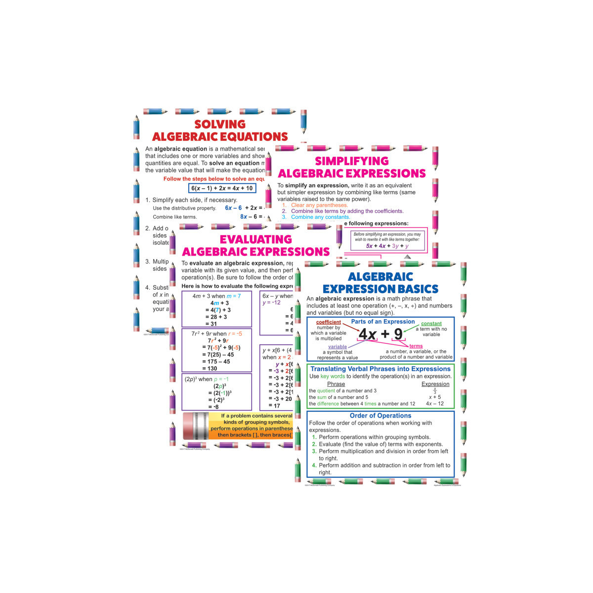 These posters clearly explain the difference between an expression and an equation, teach the steps for evaluating and simplifying expressions, and show how to solve equations. Includes 4 posters. Each poster measures 17" x 22".