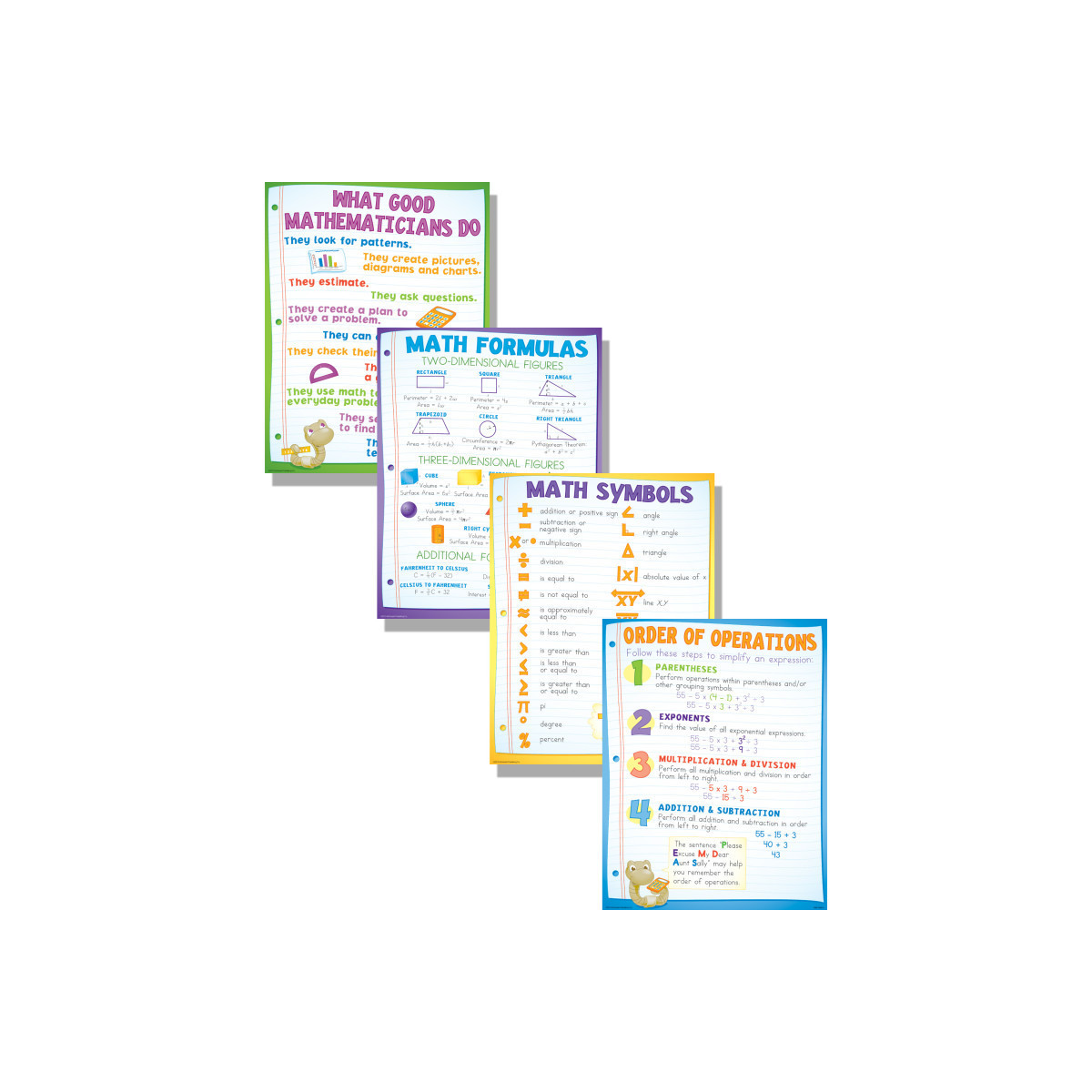 We've taken our best-selling basic math concepts and combined then into one that’s sure to become a teacher favorite. The concepts include the order of operations, math symbols, math formulas, and what good mathematicians do. Includes 4 posters. Each poster measures 17" x 22".