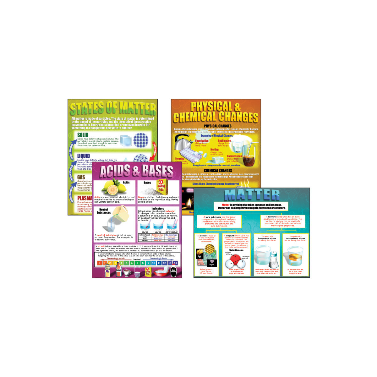 These posters teach the difference between physical and chemical changes, key information about acids and bases, the states of matter, and the characteristics of elements, compounds, and mixtures. Includes 4 posters. Each poster measures 17" x 22".