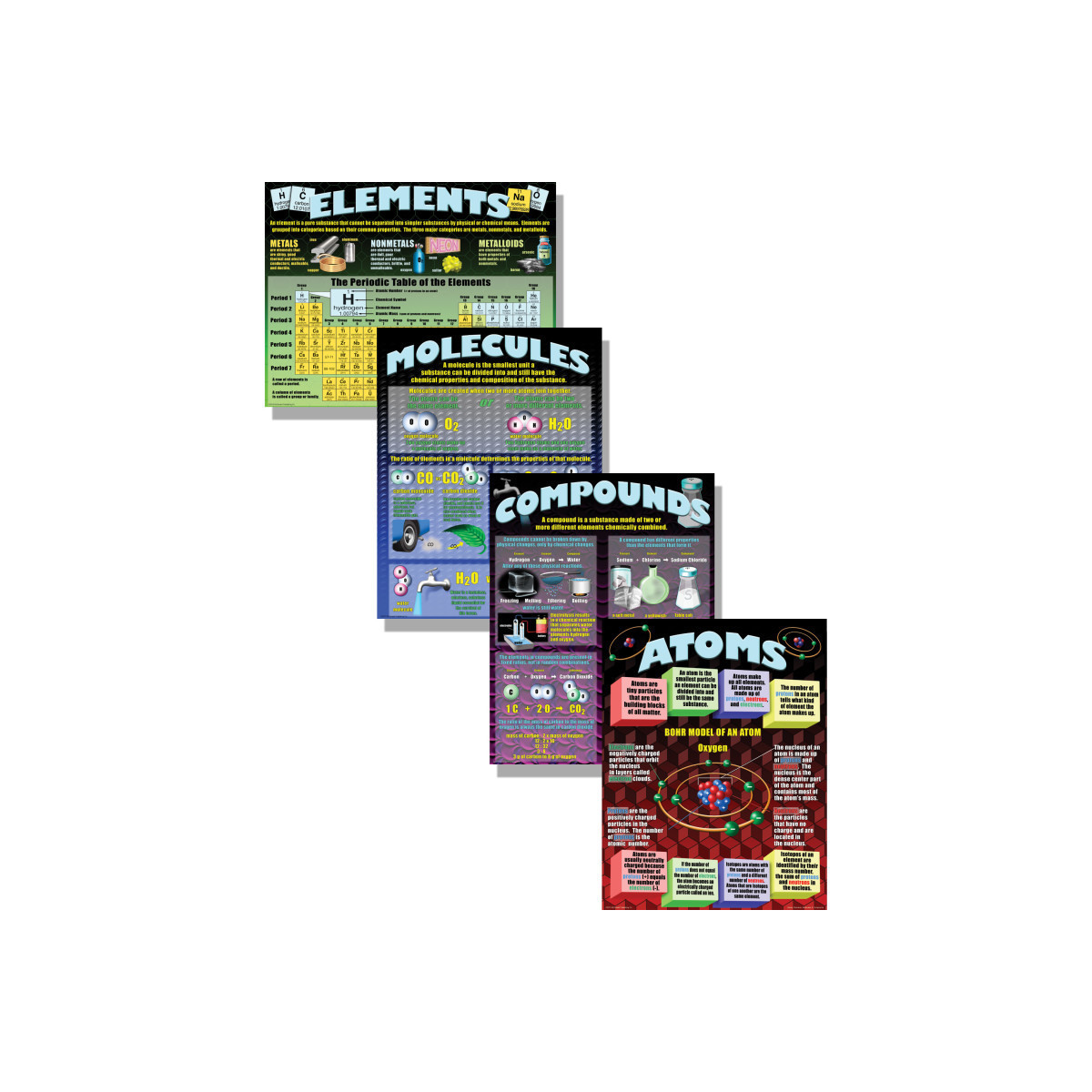Turn your young scientists into experts on these basic science concepts. Students learn the parts of an atom, the arrangement of elements in the periodic table, the structure of molecules, the characteristics of compounds, and more. Includes 4 posters. Each poster measures 17" x 22".