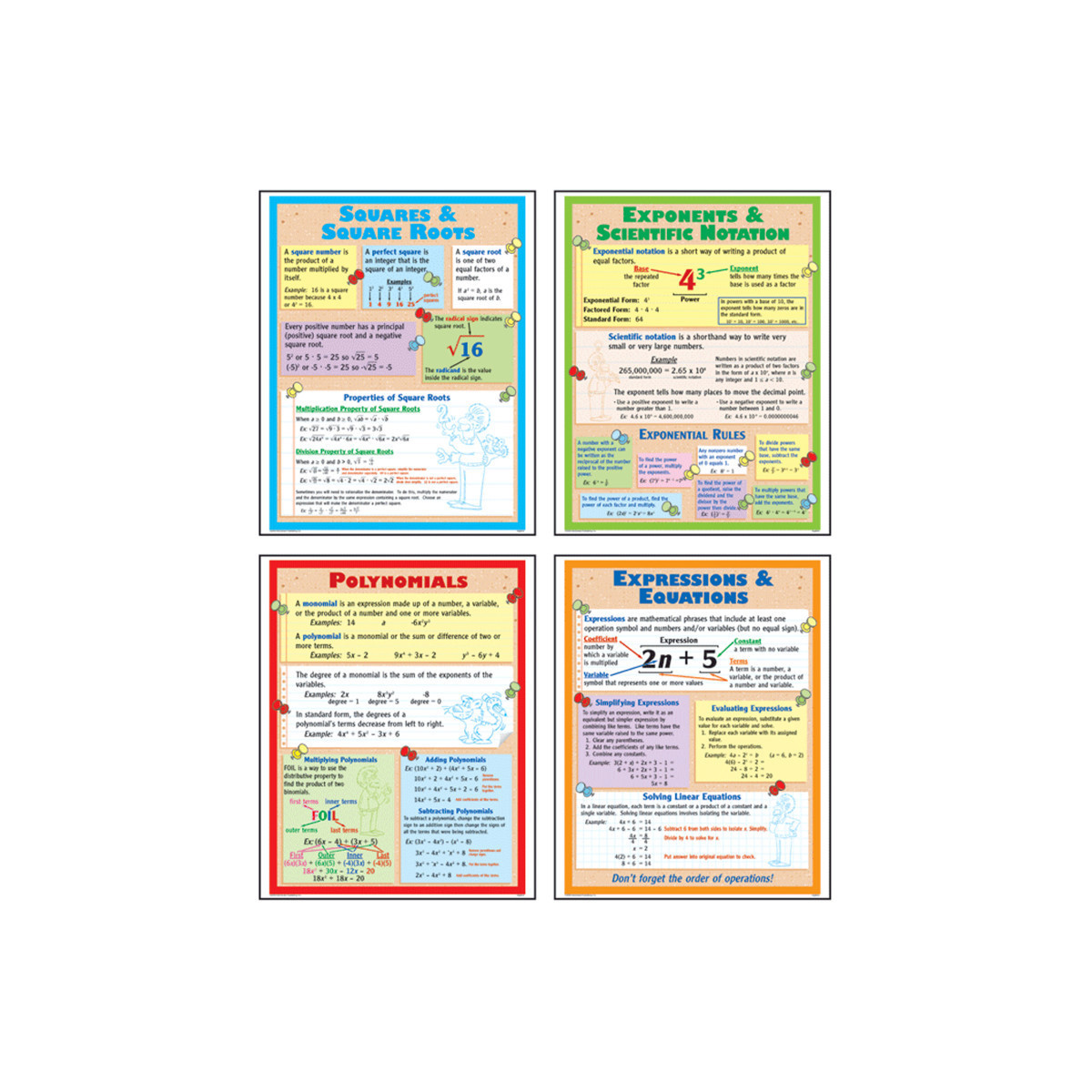 These colorful posters present important information about polynomials, squares and square roots, expressions and equations, and exponents and scientific notation. Includes 4 posters. Each poster measures 17" x 22".