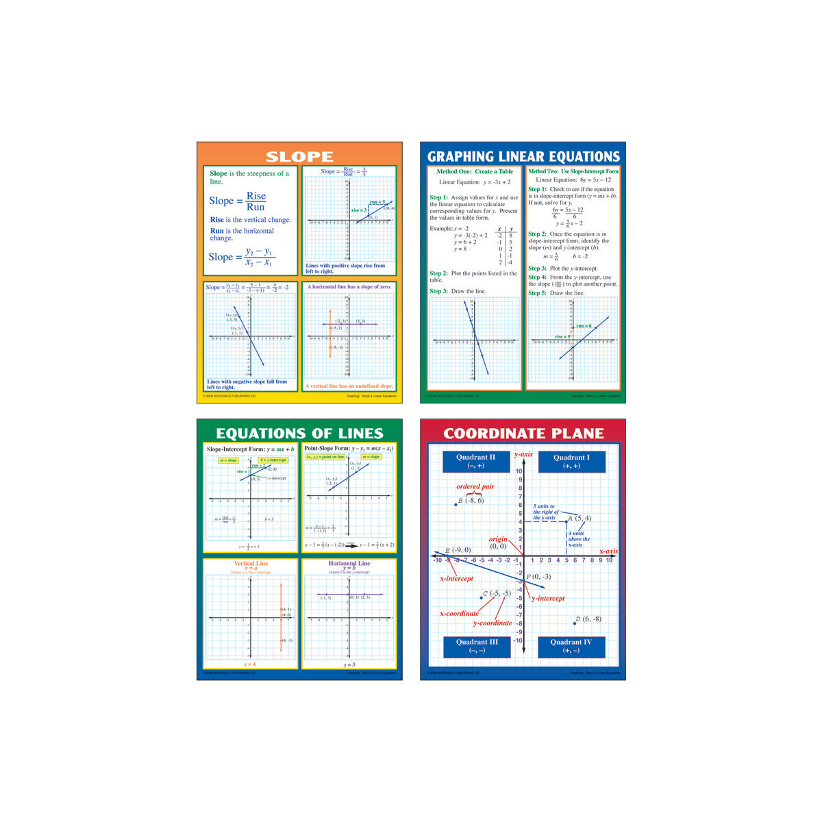 These informative posters help teach students about coordinate planes, equations of lines, slope, and methods for graphing linear equations. Includes 4 posters. Each poster measures 17" x 22".