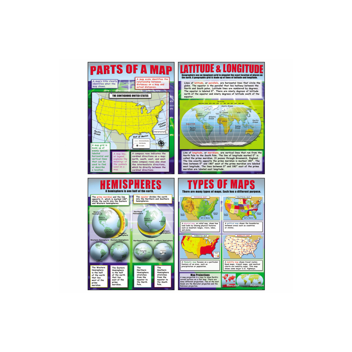 Help your students understand the world of map skills with these posters that teach them about parts of a map, types of maps, latitude and longitude, and hemispheres. Includes 4 posters. Each poster measures 17" x 22".