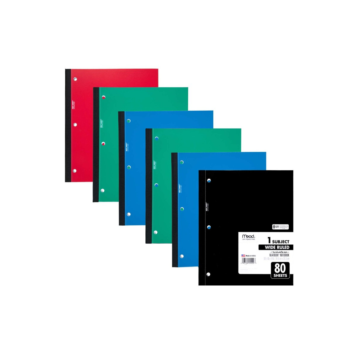Bound, 3 hole books permit full-sized perforated pages to be torn out neatly without ragged edges. Durable spine ends the annoyance of snagging wires, yet allows for easy writing on both sides of the paper, 10-1/2" x 8", wide ruled, 80 sheets. Wide ruled sheets maximize space for notetaking at school, work or home. Assorted colors - no color choice upon ordering. Sold as a pack of 6 notebooks.