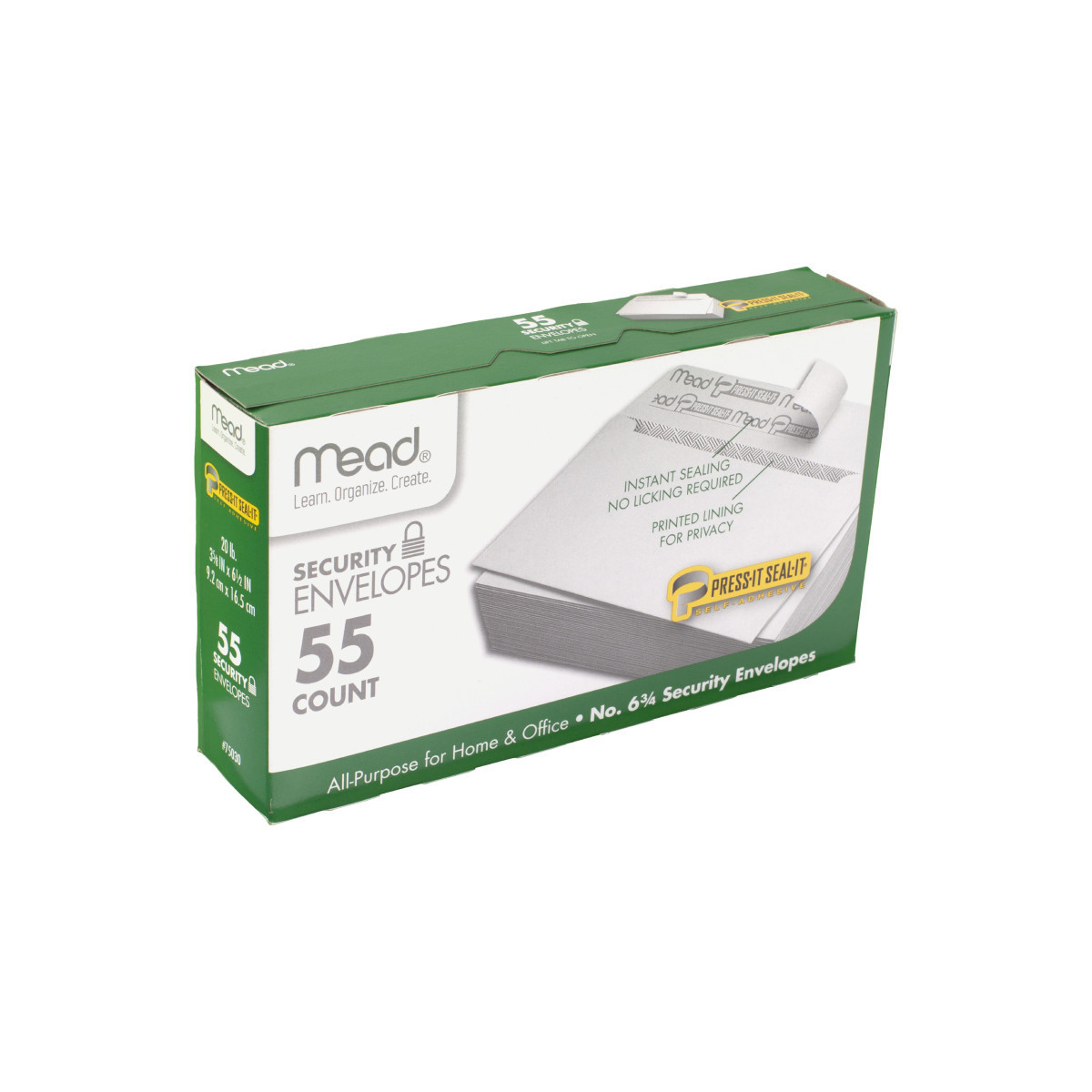 Mead® #6 3/4 Press-It Seal-It® Security Envelopes feature a self-adhesive seal and a security lining to ensure privacy. The #6 3/4 size envelopes measure 3.625" x 6.5". Includes 55 white envelopes per box.