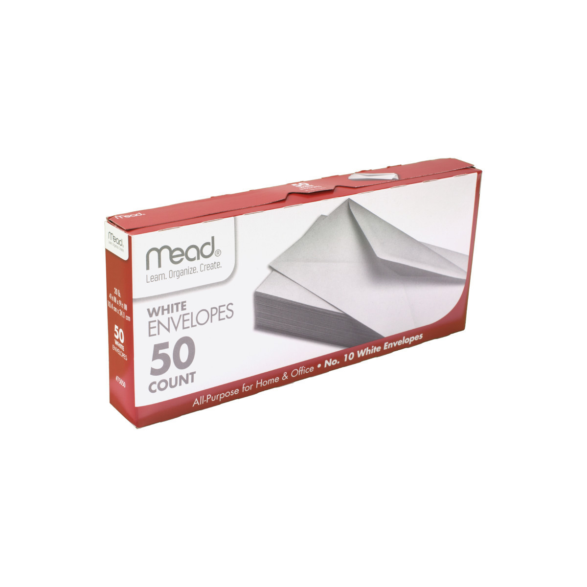 Mead plain white envelopes are ideal for use in the home or at the office. Traditional gummed-adhesive V-flap closure. Substantial business-weight paper. The No. 10 size measures 4.13" x 9.50" and is ideal for many business mailings. Tastefully attractive smooth finish. Includes 50 envelopes per box.