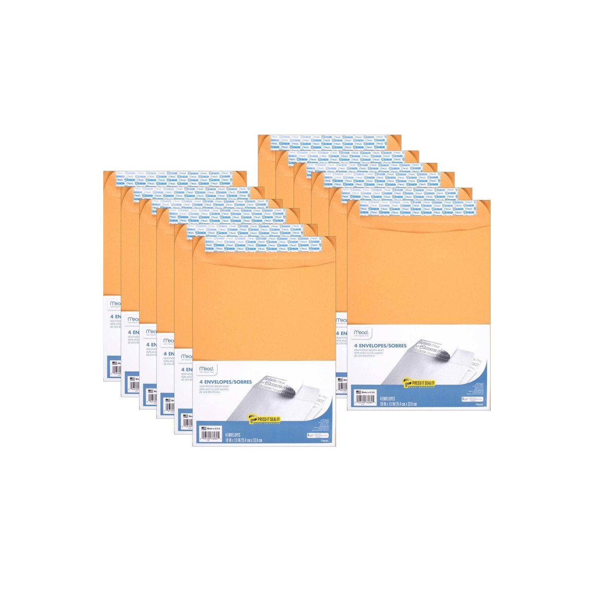 Mead® Press-It Seal-It® Envelopes feature a self-adhesive seal and brown kraft material. Envelopes measure 10" x 13" in size. Includes 4 envelopes per pack. Sold as 12 packs for a total of 48 envelopes.