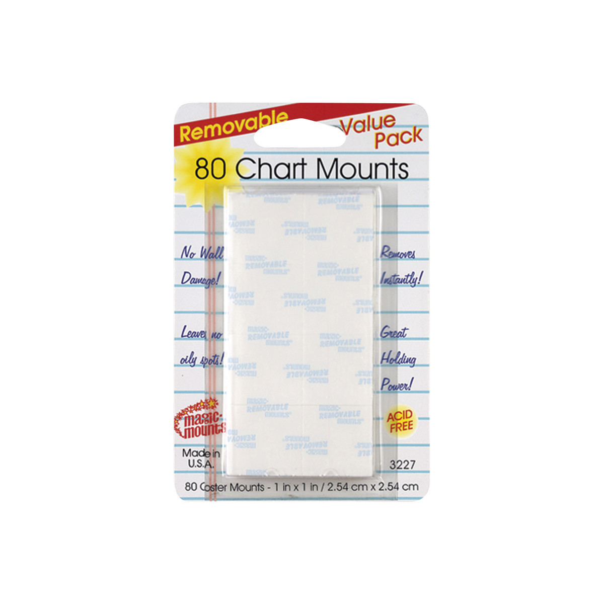 Our revolutionary adhesive bonding system secures tightly to most surfaces including drywall, painted block, brick, glass, tile, paneling and most other wall surfaces. And as one of the "original" removable adhesives, it removes cleanly with no residue, oily spots, or marring of walls... guaranteed! These wall savers get an "A." Teacher tested and preferred, this remarkable removable adhesive holds securely and removes cleanly up to 2 years. Removable Chart Mounting Tabs 1"x1".