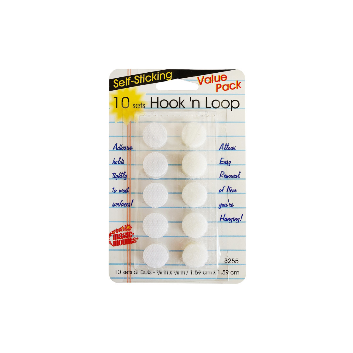 Hook 'n loop dots can be used to adhere various items to boards, charts, folders and more. Adhesive holds tightly to most surfaces and allows easy removal of the item you are hanging. Convenient pre-cut dots measure 5/8" diameter. Strong interlock system. Easy to apply pre cut dots. Each pack includes 10 sets of dots.