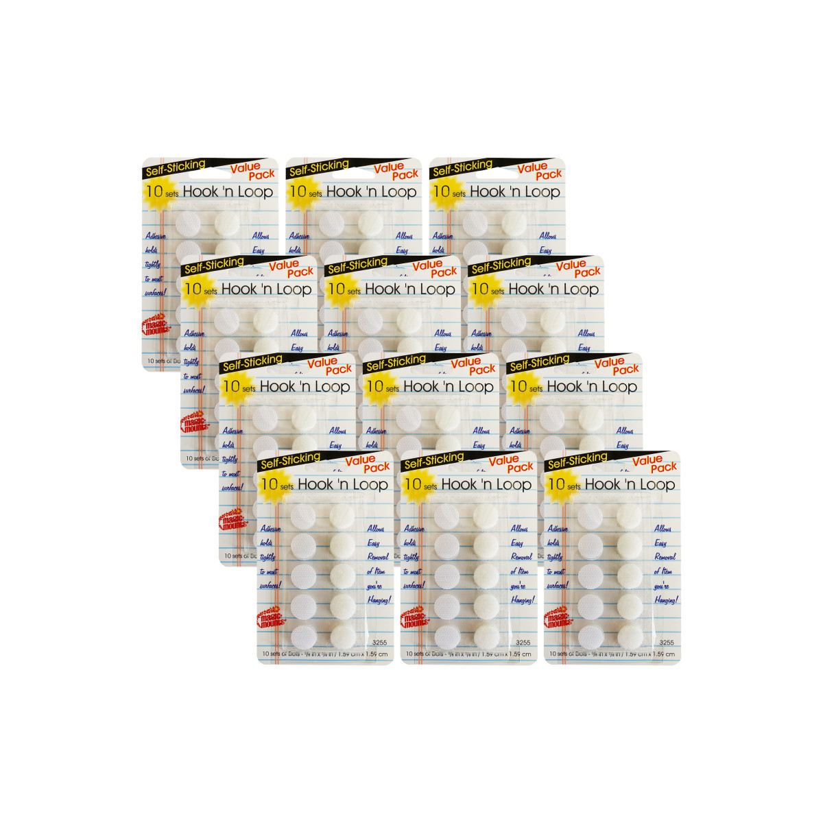 Hook 'n loop dots can be used to adhere various items to boards, charts, folders and more. Adhesive holds tightly to most surfaces and allows easy removal of the item you are hanging. Convenient pre-cut dots measure 5/8" diameter. Strong interlock system. Easy to apply pre cut dots. Each pack includes 10 sets of dots. Sold as 12 packs for a total of 120 sets of dots.