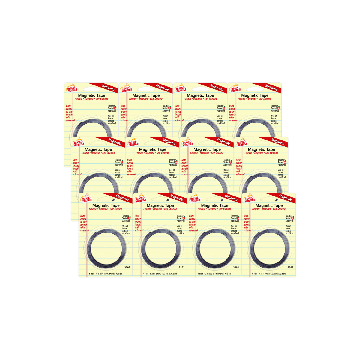 Magnet tape rolls are adhesive on one side and magnetic on the other. You can stick the adhesive side of the magnetic tape to an object. This can used for warehouse shelving, craft projects, hanging signs/displays or attaching tools to machines. Each roll measures 1/2" x 30". Sold as a pack of 12 rolls.