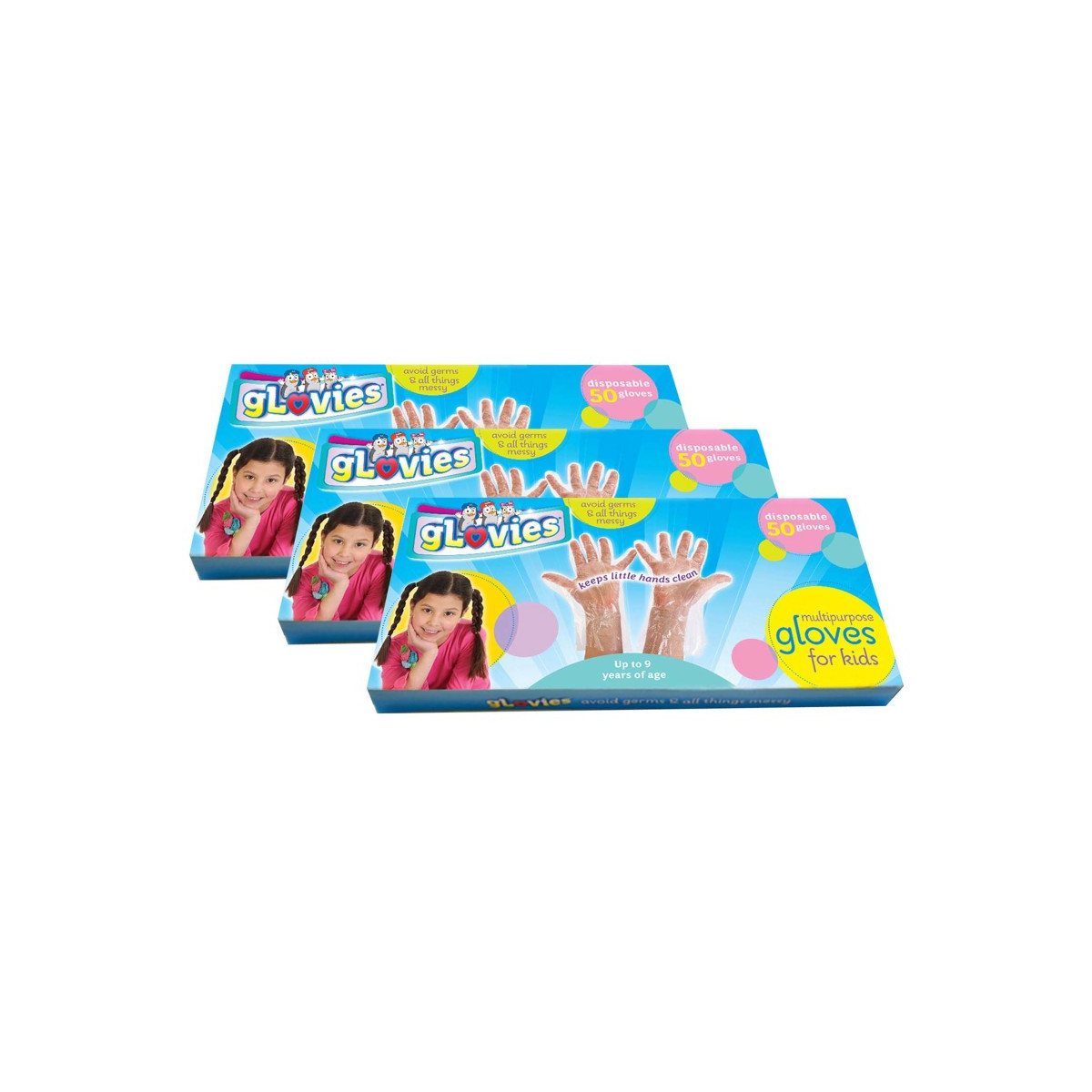 Stay mess free during craft time and protect your kids from all things germy with these latex-free Multipurpose Glovies. Perfect for keeping little hands clean. Glovies are disposable, non-biodegradable, and transparent with an embossed surface for a better grip. The 50 count makes up 25 pairs of gloves. Size: 7" x 9".