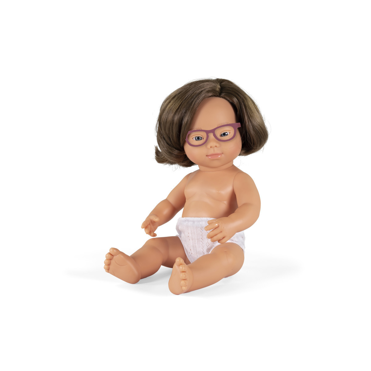 Caucasian Girl 15" Doll with down syndrome and glasses. This doll will help raise kid's awareness of diversity and inclusion, promoting values of equality, integration and acceptance. Miniland dolls promote inclusive values as well as empathy and acceptance of people no matter what their race, sex or condition may be.