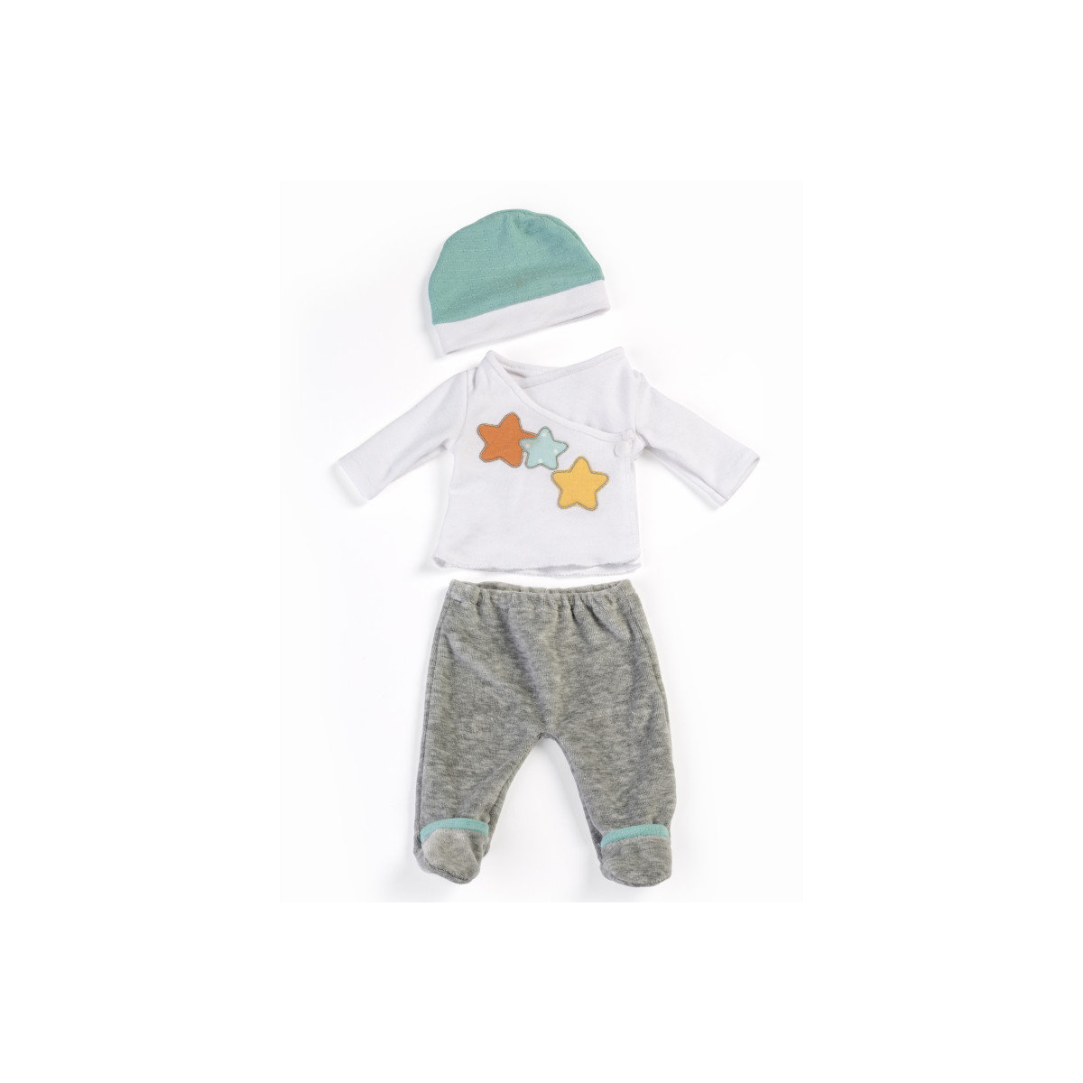 Part of a collection of clothes and accessories for a new-born dolls. It includes the most common clothes and accessories in everyday baby situations such as bath time, nap time or going out for a walk. With different types of fasteners to help the development of fine psychomotor skills. Comes with 1 T-shirt, 1 pair of trousers and 1 cap. Gender neutral colors. Soft to the touch fabric. Perfect accessory for 15" dolls.