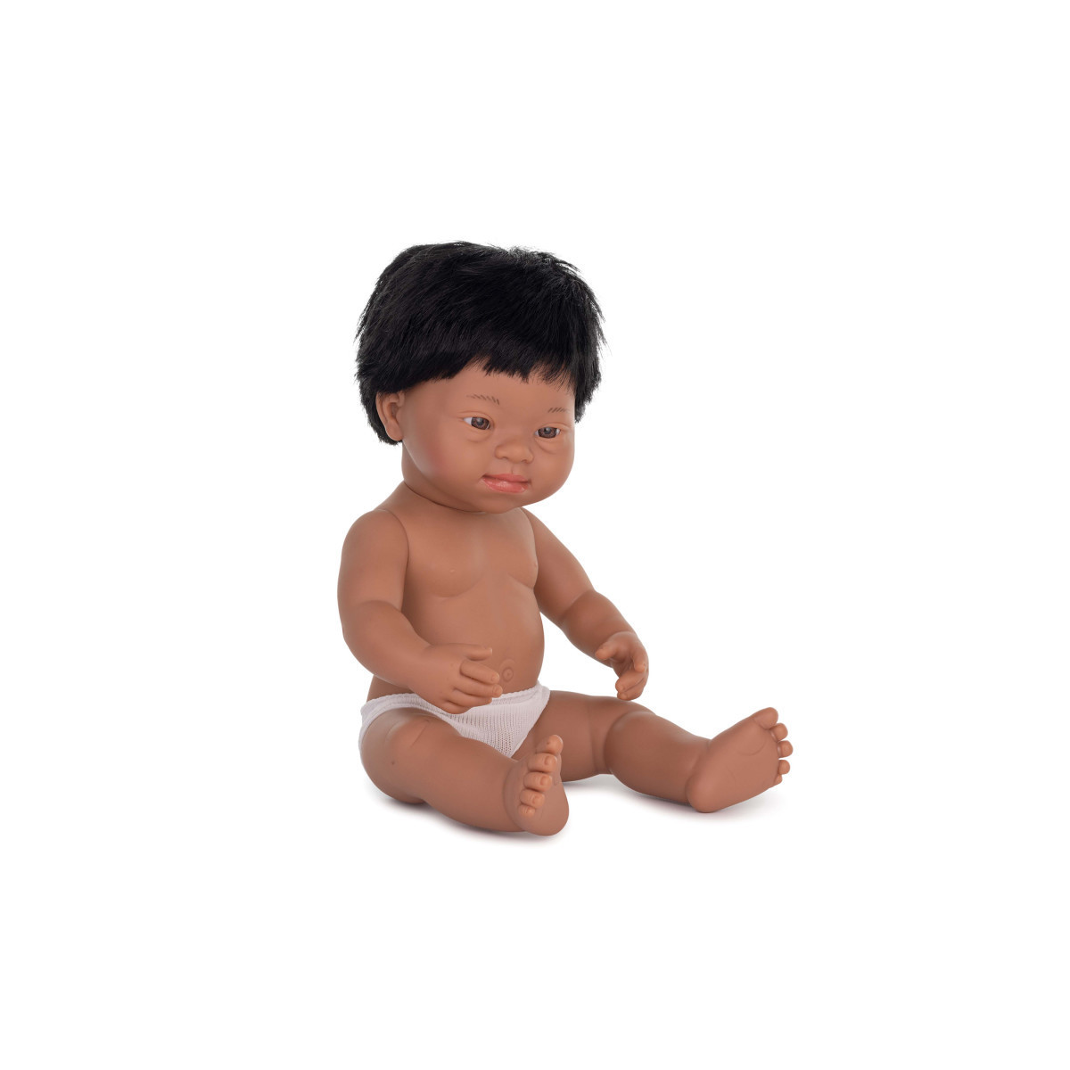 Miniland boy doll with Down Syndrome with Hispanic features. This doll belongs to our Miniland Dolls collection that promotes the value of equality within kids regardless of their race, gender or condition and allows them to also learn about the diversity in all of us and how to develop social skills such as empathy and tolerance. Made of high-quality soft vinyl with a light vanilla scent. This doll is also recyclable. Made in Spain. Anatomically correct doll with realistic differences between boy and girl dolls. Articulated head, arms and legs that can fully rotate allowing the doll to sit, stand or lie down. Doll is washable and it will not affect their quality and durability. It is 15 inches long. Comes individually packaged in a polybag with underwear. For ages 10-72 months.