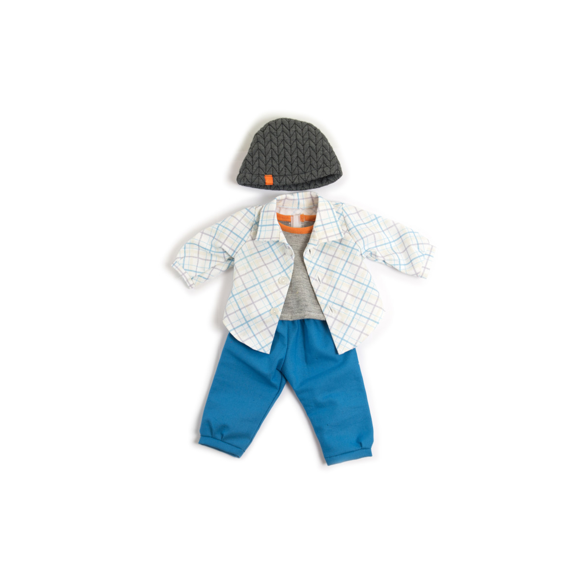 Mild weather blue pant and shirt set for dolls sized 15"-15 3/4". Includes beanie hat, undershirt, buttoned shirt and pants so children can practice dressing skills. Designed to help children meet their needs of self-awareness and personal autonomy.