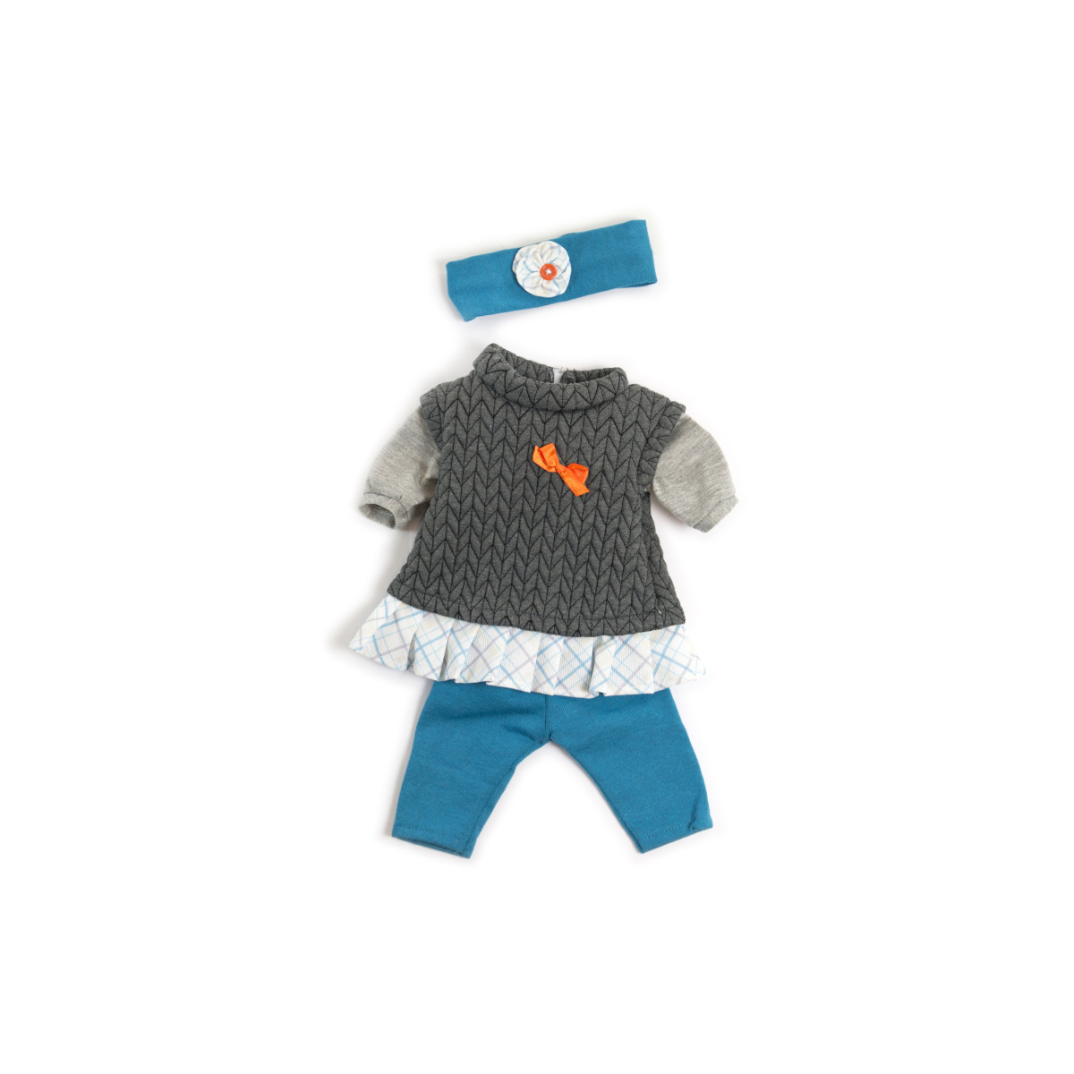 Mild weather gray pant and sweater set with headband for dolls sized 15"-15 3/4". Includes headband, sweater and pants. Used to teach children how to dress for climate common in fall and spring seasons. Designed to help children meet their needs of self-awareness and personal autonomy.