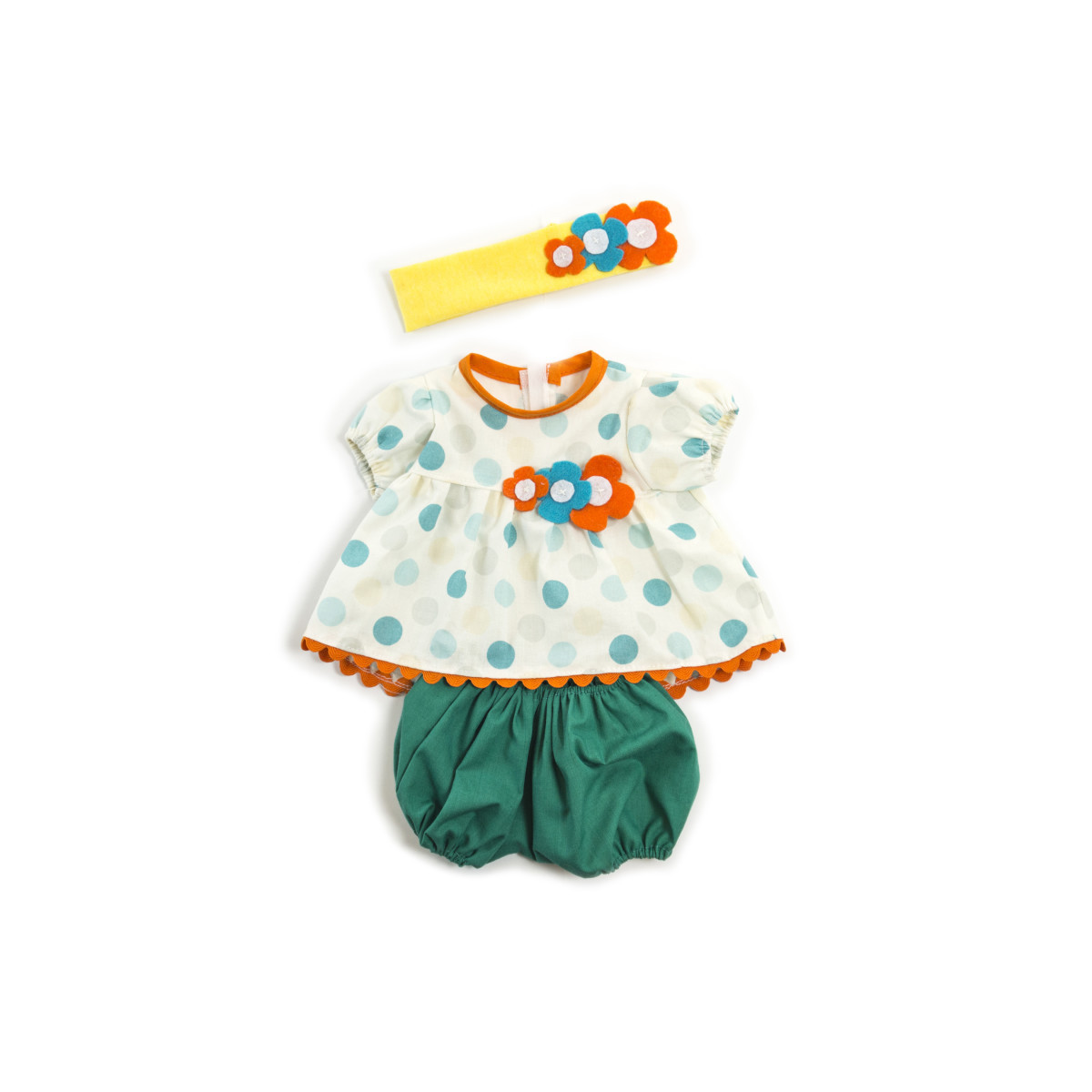 Warm weather blouse set with headband for dolls sized 15"-15 3/4". Includes headband, shirt and shorts so children can understand how to dress in warmer weather.