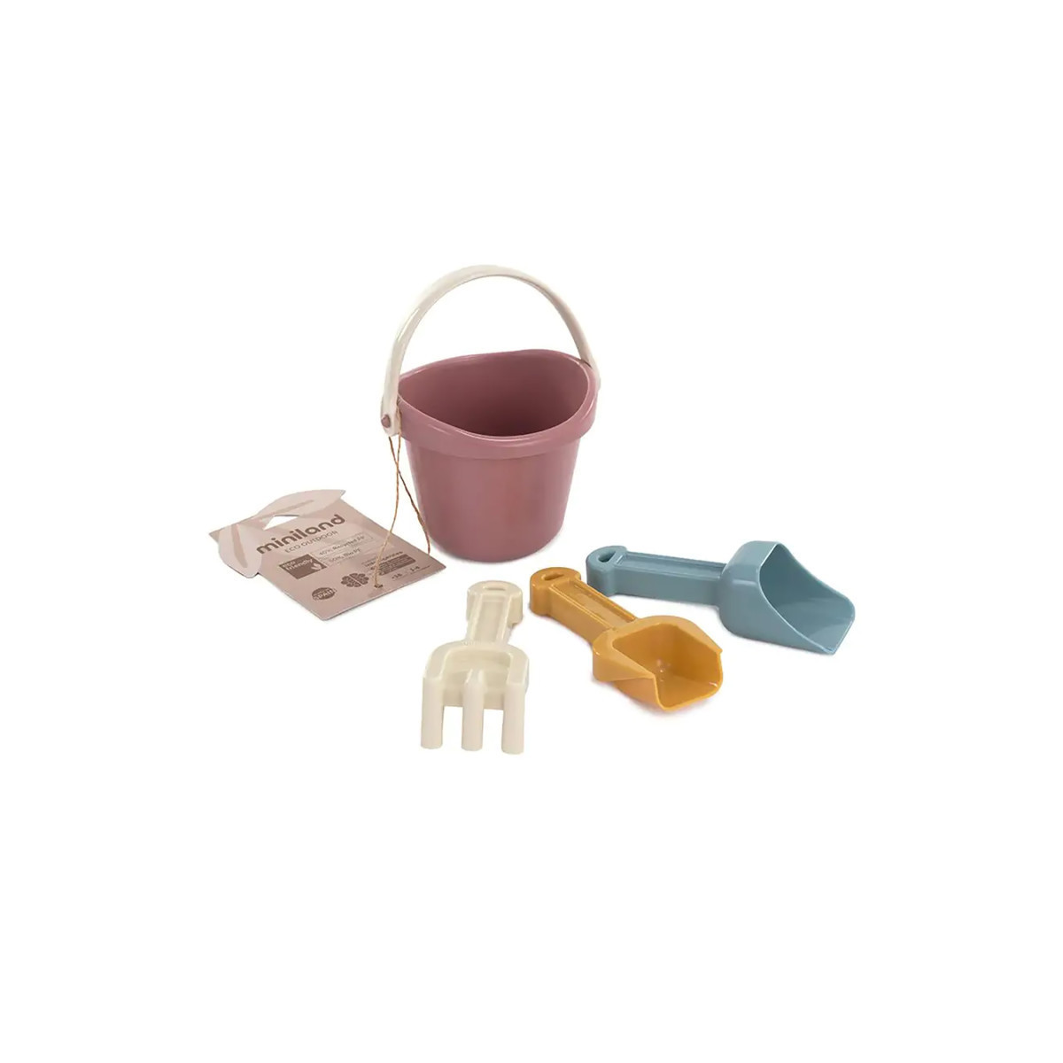 - ECO Baby Sand Set in pastel colors includes a bucket, shovel, dustpan and rake.